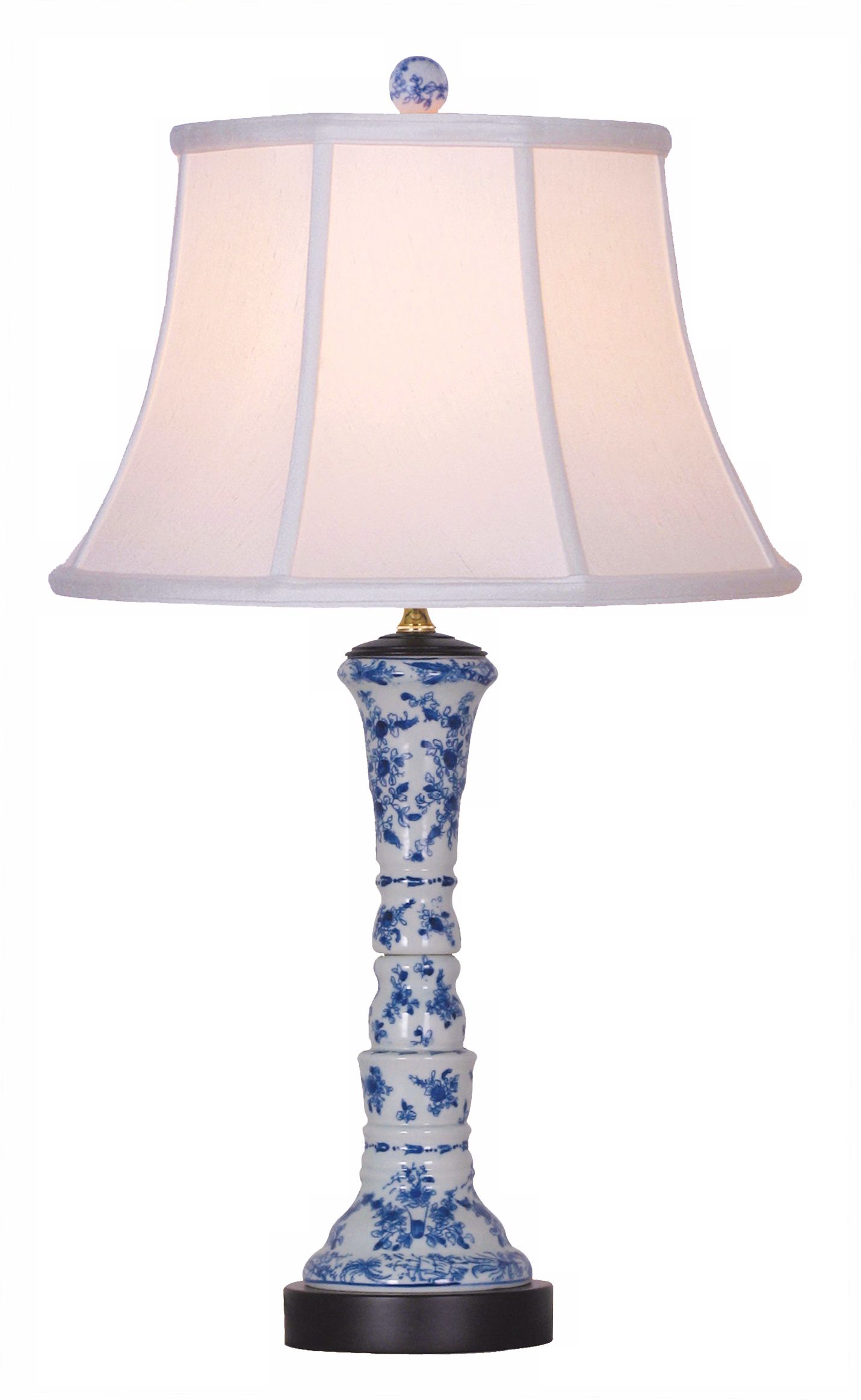 This exquisite buffet table lamp looks great in a living room or bedroom, and is perfect for traditional, country and Asian-inspired decors. The porcelain base is a slim vase shape decorated with an intricate blue and white pattern. A satin bell shade in off white sits on top. A three-way socket gives you more lighting control.