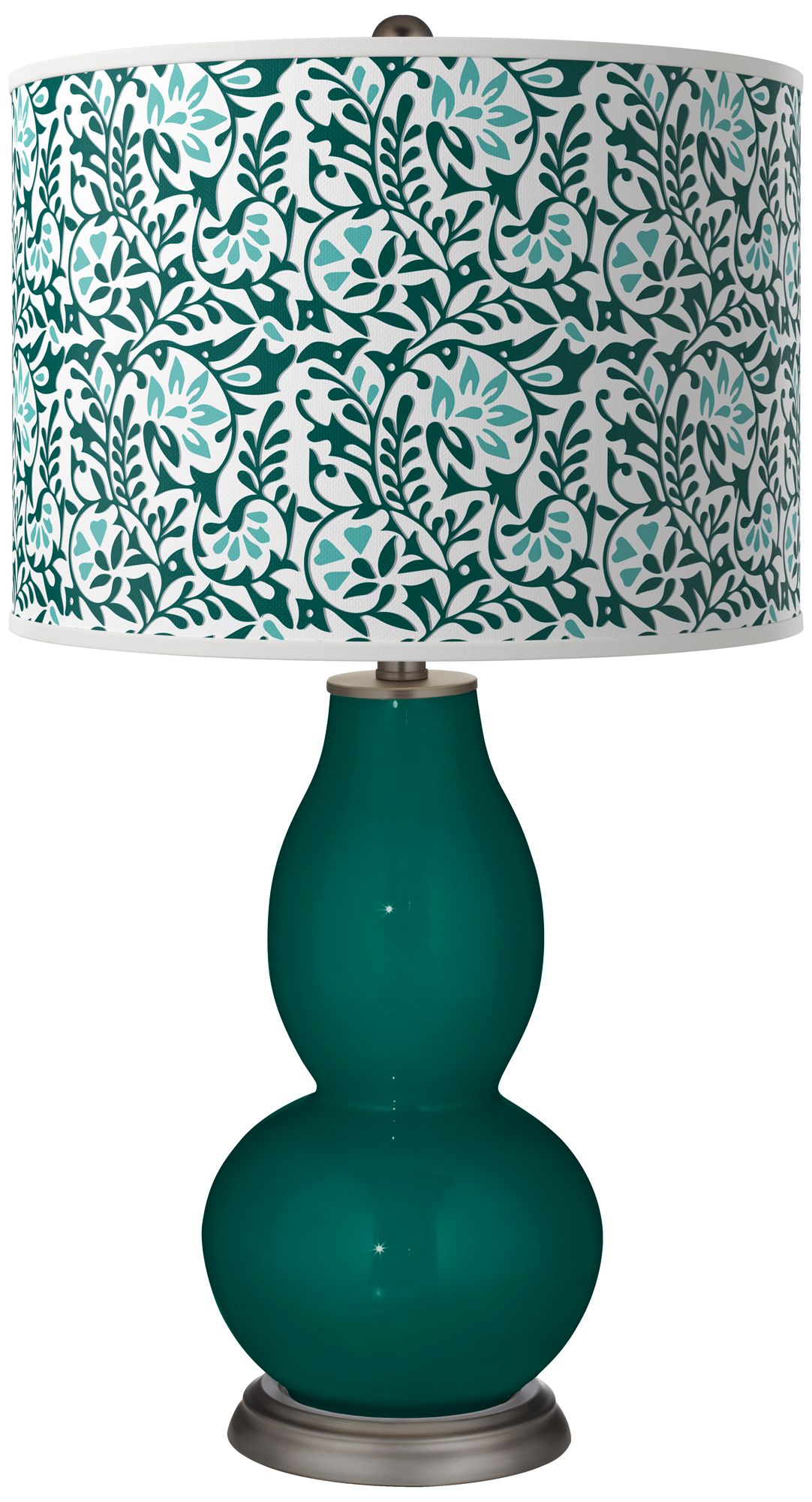 This double gourd glass table lamp from the Color + Plus™ collection offers a brilliant color accent for your home decor. The designer Blue Peacock base is hand-crafted by our experienced artisans in California, and is topped by a custom-made lamp shade. The shade features an exclusive Gardenia pattern and is printed to order. Shade process U.S. Patent # 7,347,593. Lamp base U.S. Patent # 8,899,798.