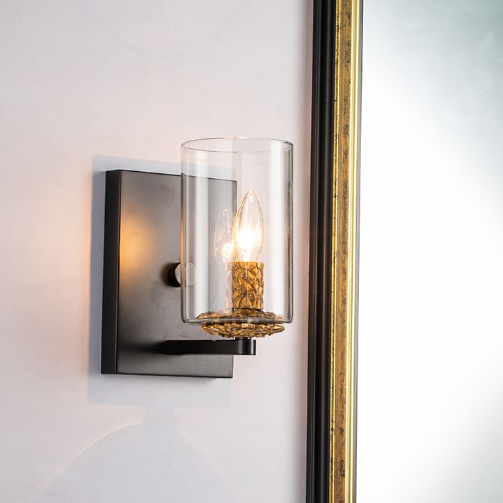 Charming and vintage inspired, the Bolivar 1-light wall sconce uses a mixed gold and Matte black finishes to give a genuine and edgy candle style design that shows off the antique gold detail used on the candle sleeve. This one-light wall sconce has cylinder shaped clear glass, and uses a modern crisp shape to update your bathroom space. The rectangle back plate finished in a sophisticated matte black s is the perfect finishing detail.