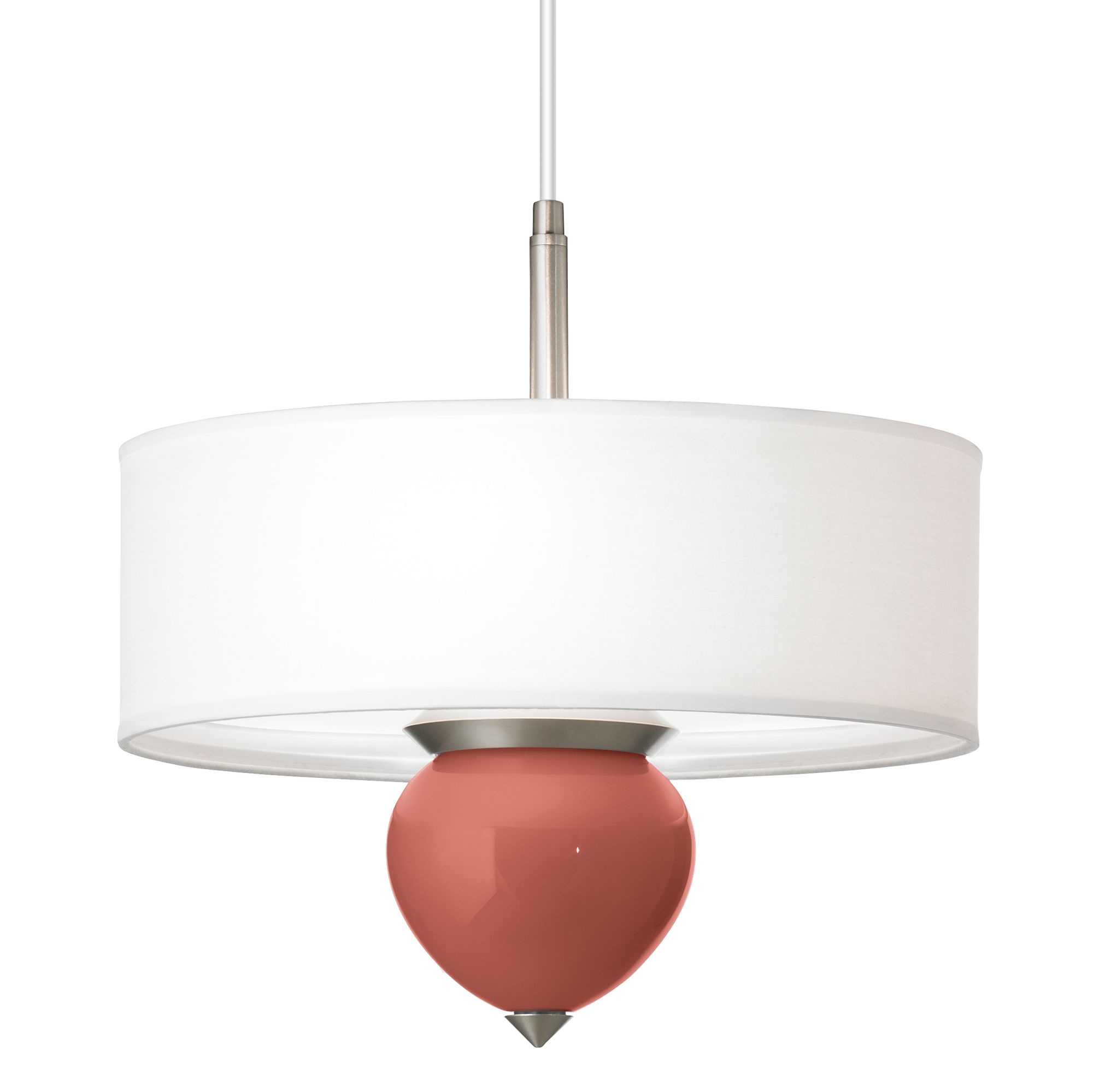 This stunning contemporary pendant chandelier from the Color + Plus™ lighting collection will add personality and a punch of designer color to your home decor. The design features an exclusive Brick Paver red designer color font and brushed nickel finish accents that enliven the white drum shade above. The fixture is equipped with an acrylic diffuser inside the shade to help eliminate glare and help provide an even light output.