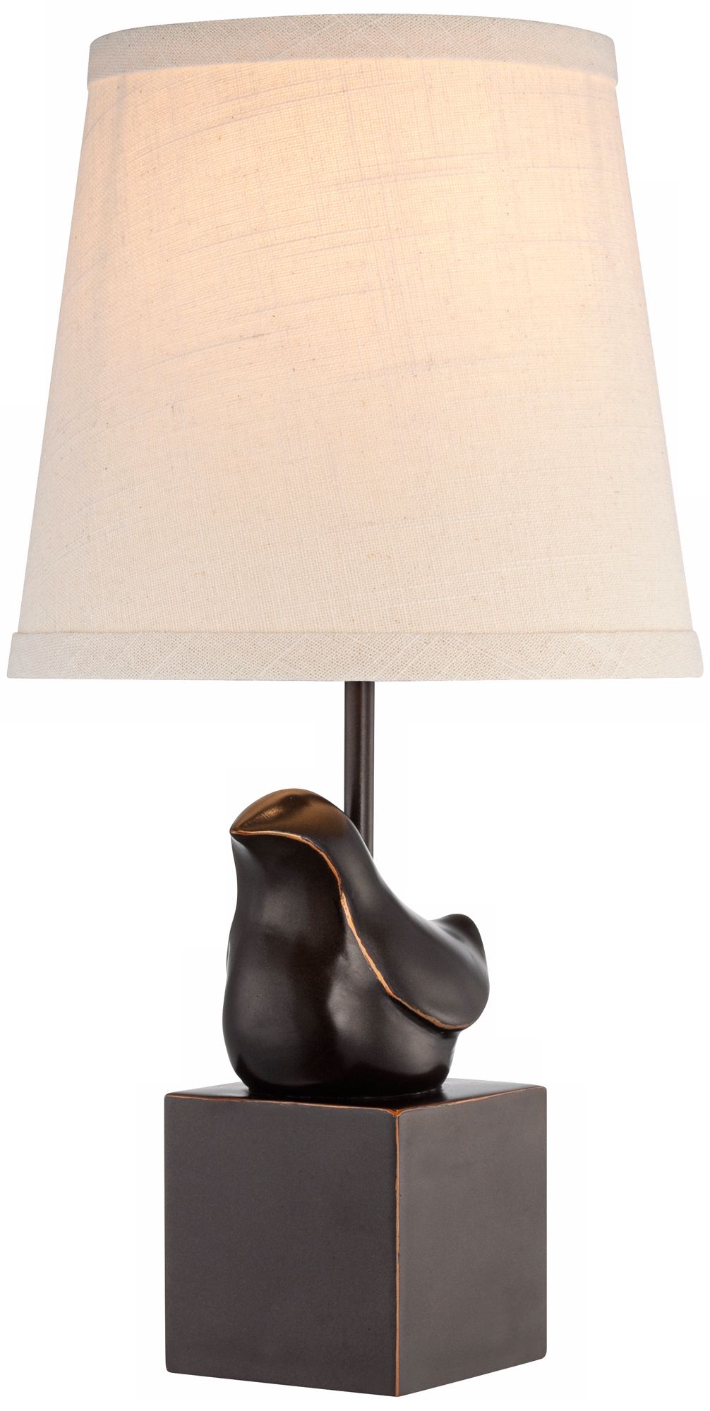 A little modern and a little quirky, this table bird accent lamp will make you smile each time you turn it on. Comes in a bronze finish with a white fabric shade.
