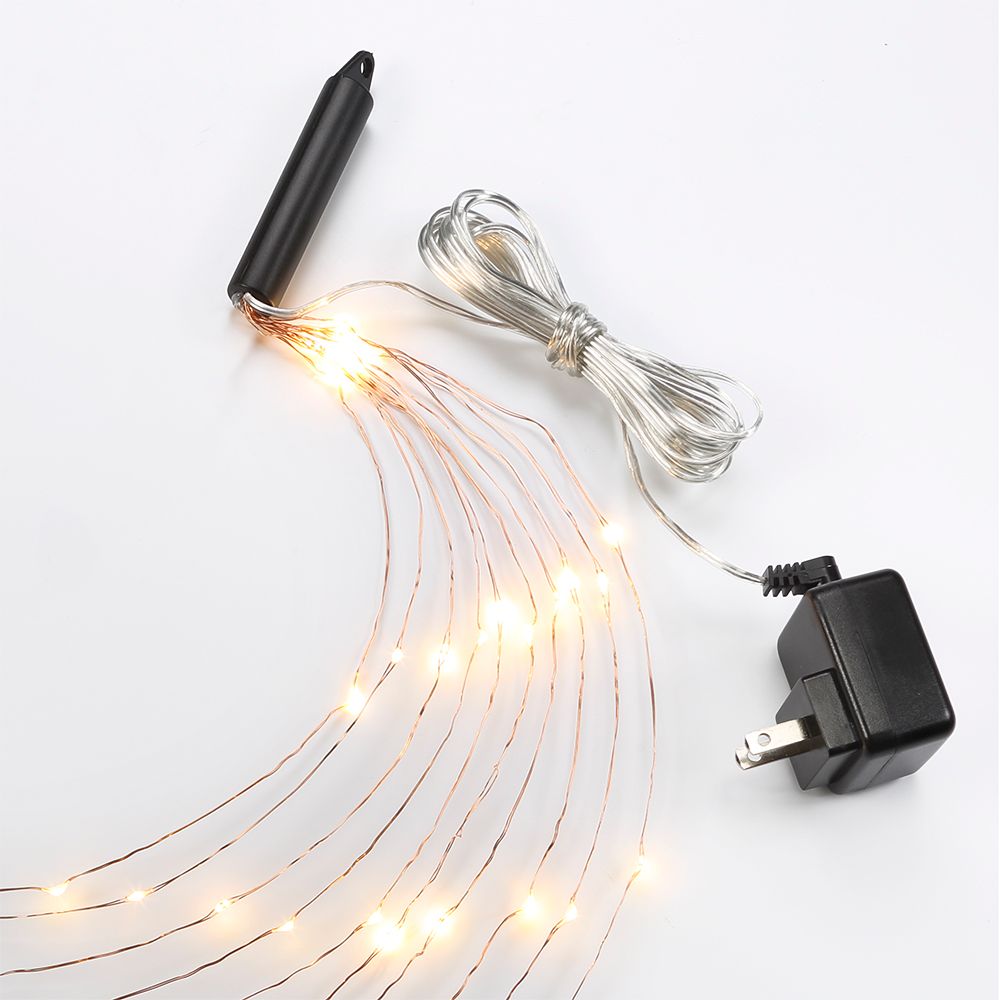 By Bulbrite, this multi-strand LED starry string light set features 10 strands, each with 25 LED lights and a 10-foot length. Perfect for setting the mood, this string light set offers copper finish moldable wire and an 8-watt built-in LED module. Features 2700K warm white color temperature and requires plug-in installation.