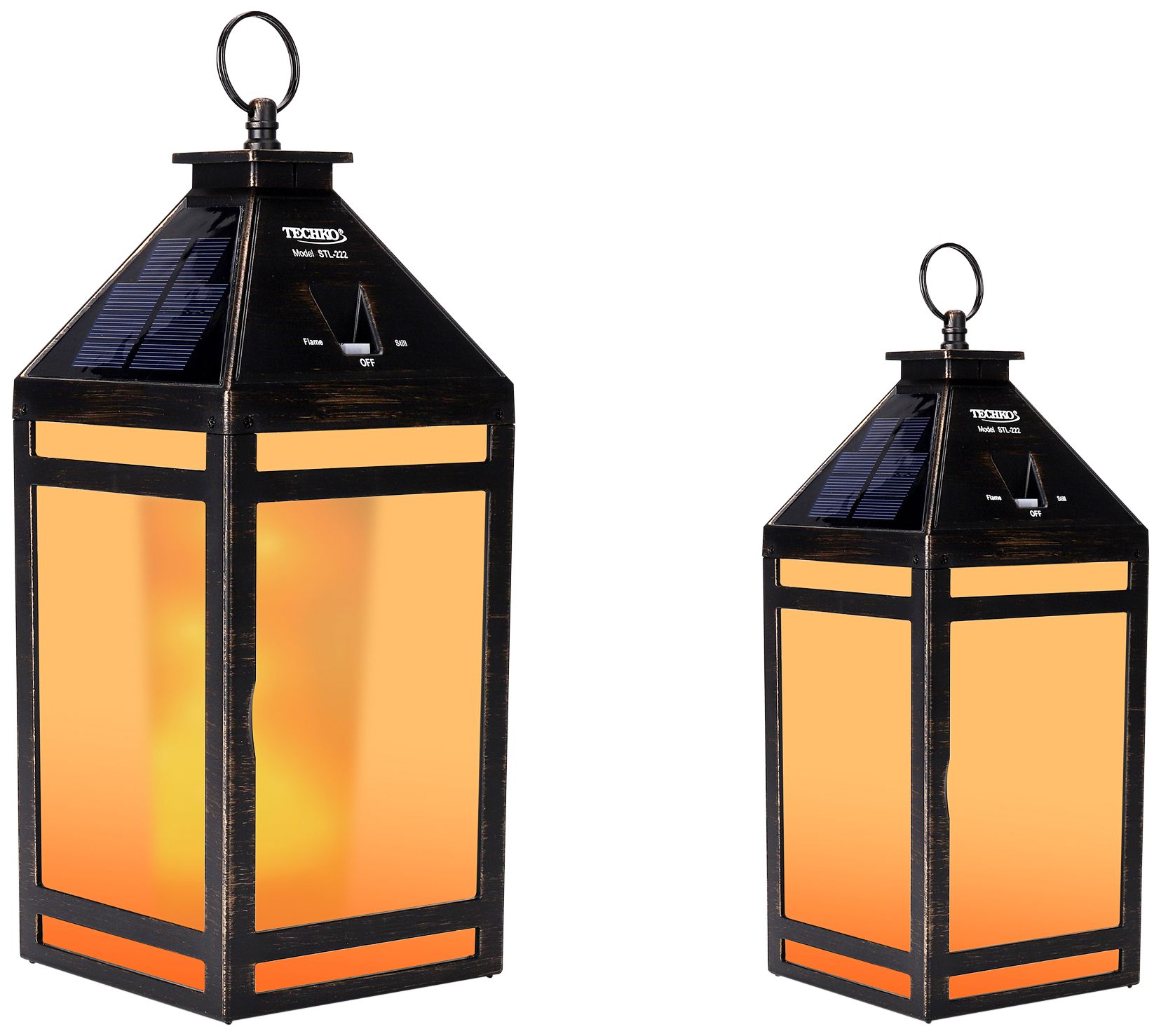 A flickering flame effect for this modern solar LED hanging lanterns adds the charm of classic torches to your garden. Also offering a still amber light for everyday elegance, the lantern features a black finish and classic sloped canopy. Built-in hangers add to their versatility and they turn on at dusk and off at dawn for seamless operation.