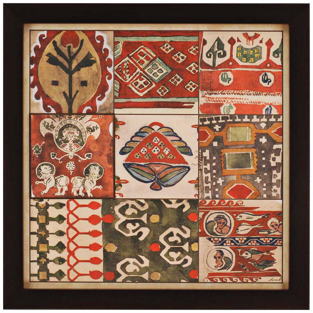 Rich warm colors make this giclee wall art the perfect addition for your home office or den. A variety of Byzantine elements are presented in a grid of 9 squares and framed in black.