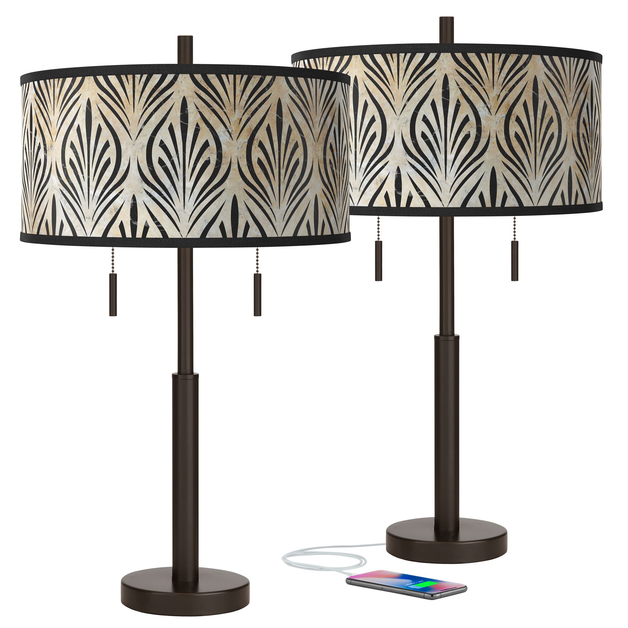 A set of two modern table lamps are the perfect lighting source when looking for both style and function. These contemporary designs feature a sleek bronze stem with Calathea Gem patterned giclee drum shades. A USB port in each base lets you conveniently charge your smartphones and other devices. Perfect to add next to a bed or seating area. Shade printing process U.S. Patent # 7,347,593.