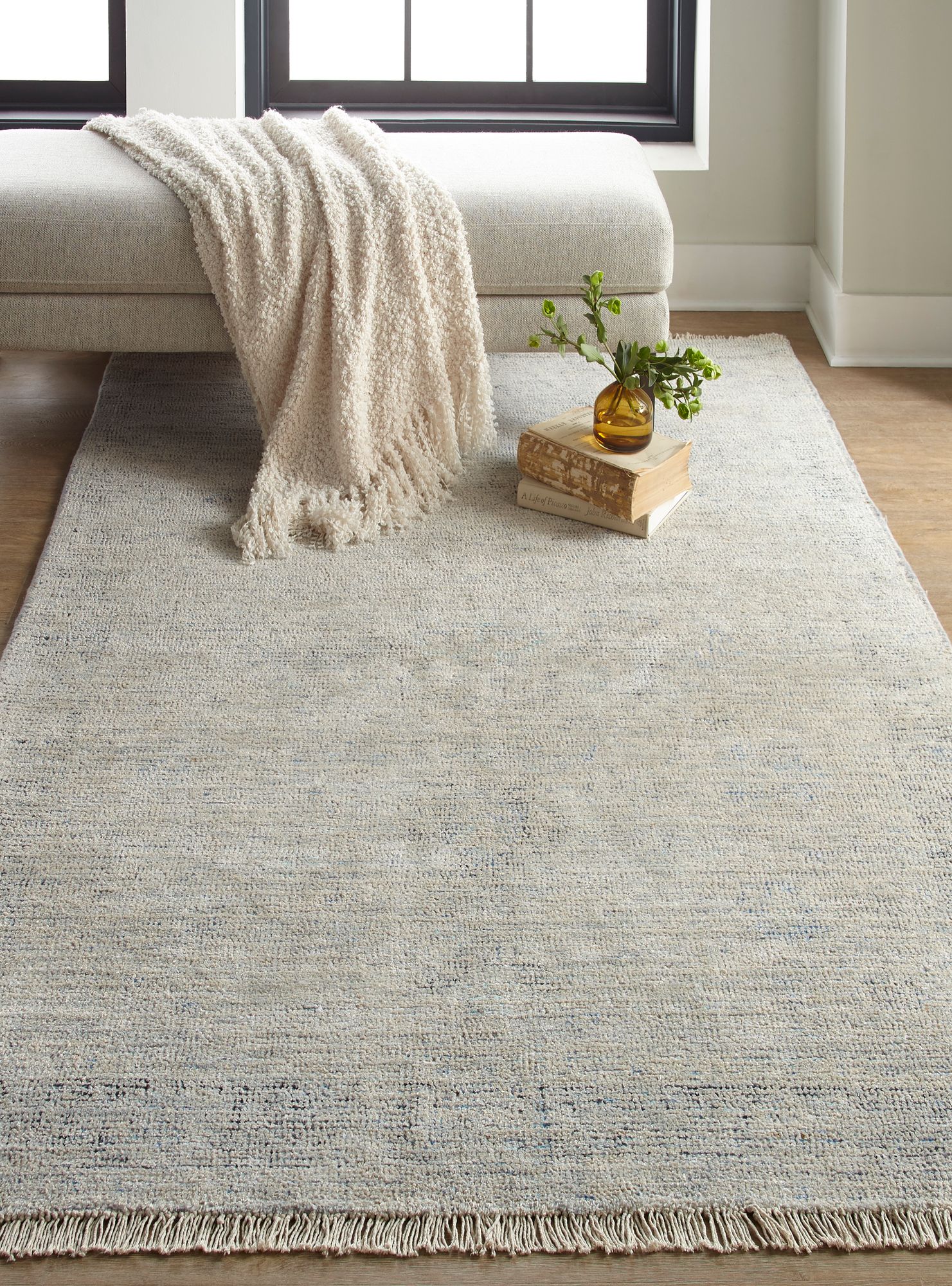 A great choice for placement in high-traffic areas, this traditional rustic rectangular area rug creates a soft, distressed feel. This classic rug is hand-woven of wool and viscose with jute backing. Warm tones of gray and blue inspire a custom living room or dining room with an iconic oriental pattern. Fringe tassel edging detail delivers a charming look.