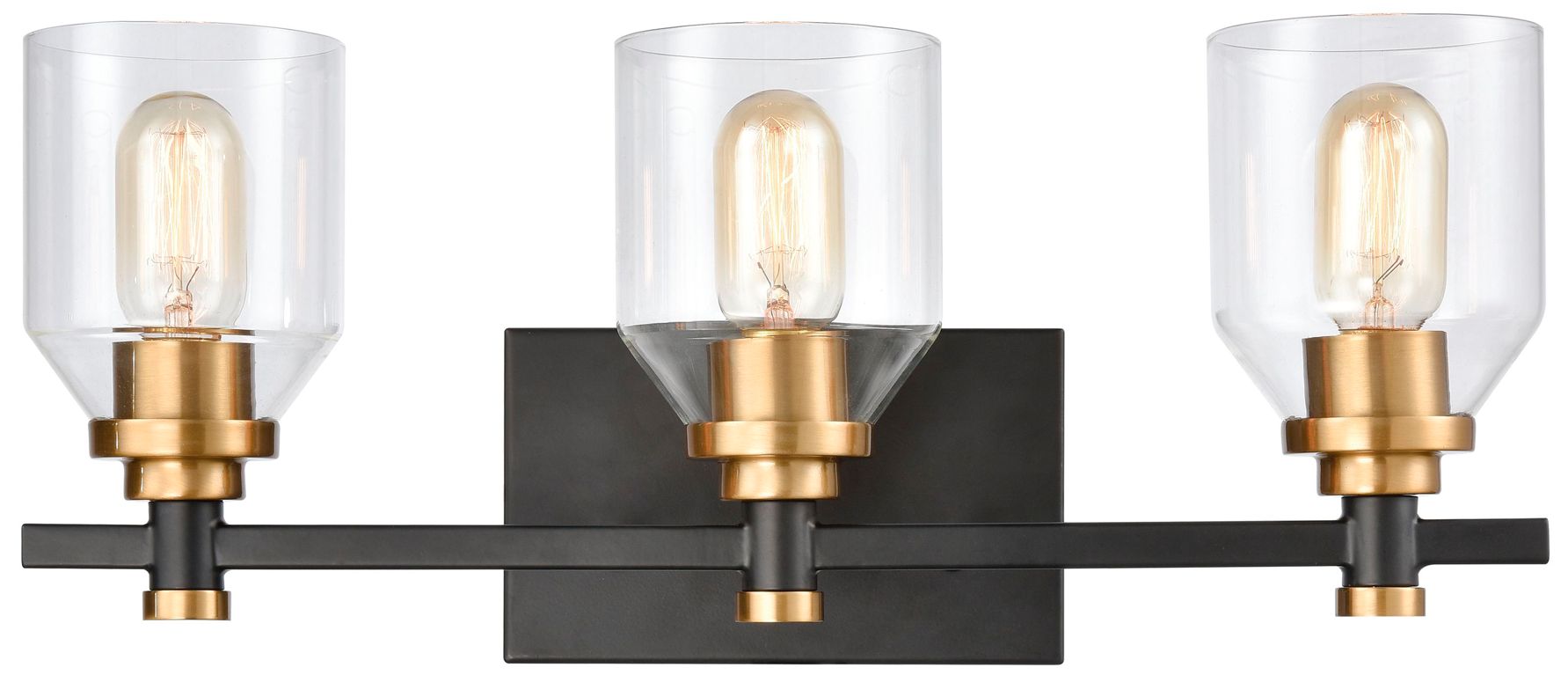 A dressed-up version of industrial style delivers a sophisticated look perfect for bathroom lighting. With a Mid-Century Modern motif, this three-light bath vanity light from the Cambria collection offers a timeless palette of matte black finish steel and satin brass accents. Precise detail of accents coincides with angular and cylindrical clear glass shades, an inspired way to add a bold look to master and guest bath settings.