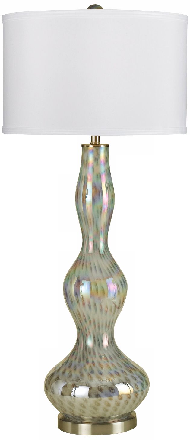 From designer Candice Olson, this shapely table lamp features a hand-blown blue luster glass base which is topped by a white poly silk shade. Handcrafted; no two are alike.