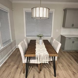 Soft and statement making, the Bodie modern four-light pendant adds a layer of luxury to any space. The tapered columns in matte brass frame its tailored fabric shade, creating a sophisticated luminaire to match your style. A frosted acrylic diffuser graces the base of its drum shade, offering inviting ambiance in your living or dining room.