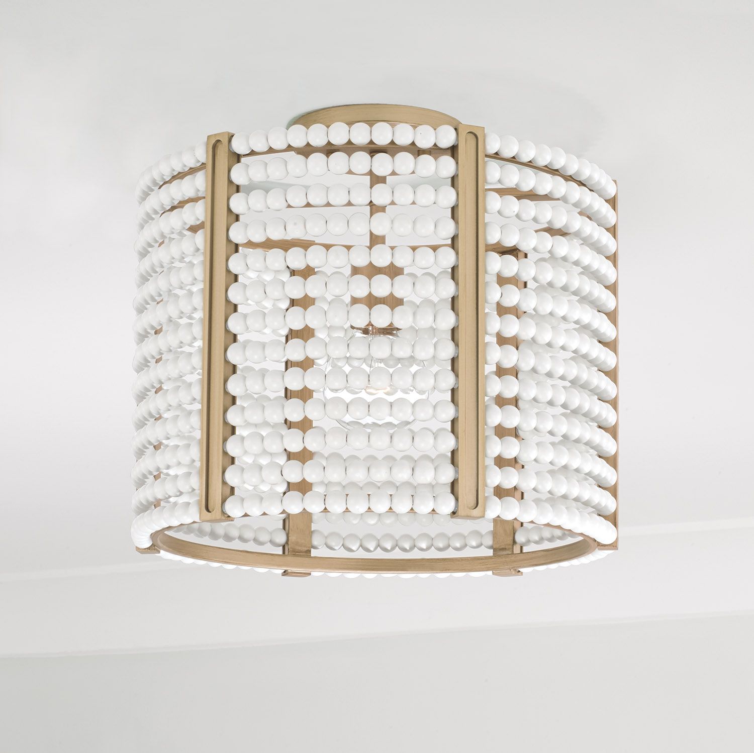 Glitz and glamour meet bohemian chic with the Brynn Dual Mount. Whether hung as a pendant or semi-flush, the classic drum silhouette and rings of matte white beads paired with the golden tones of the Painted Aged Brass finish bring laid back luxury to life.