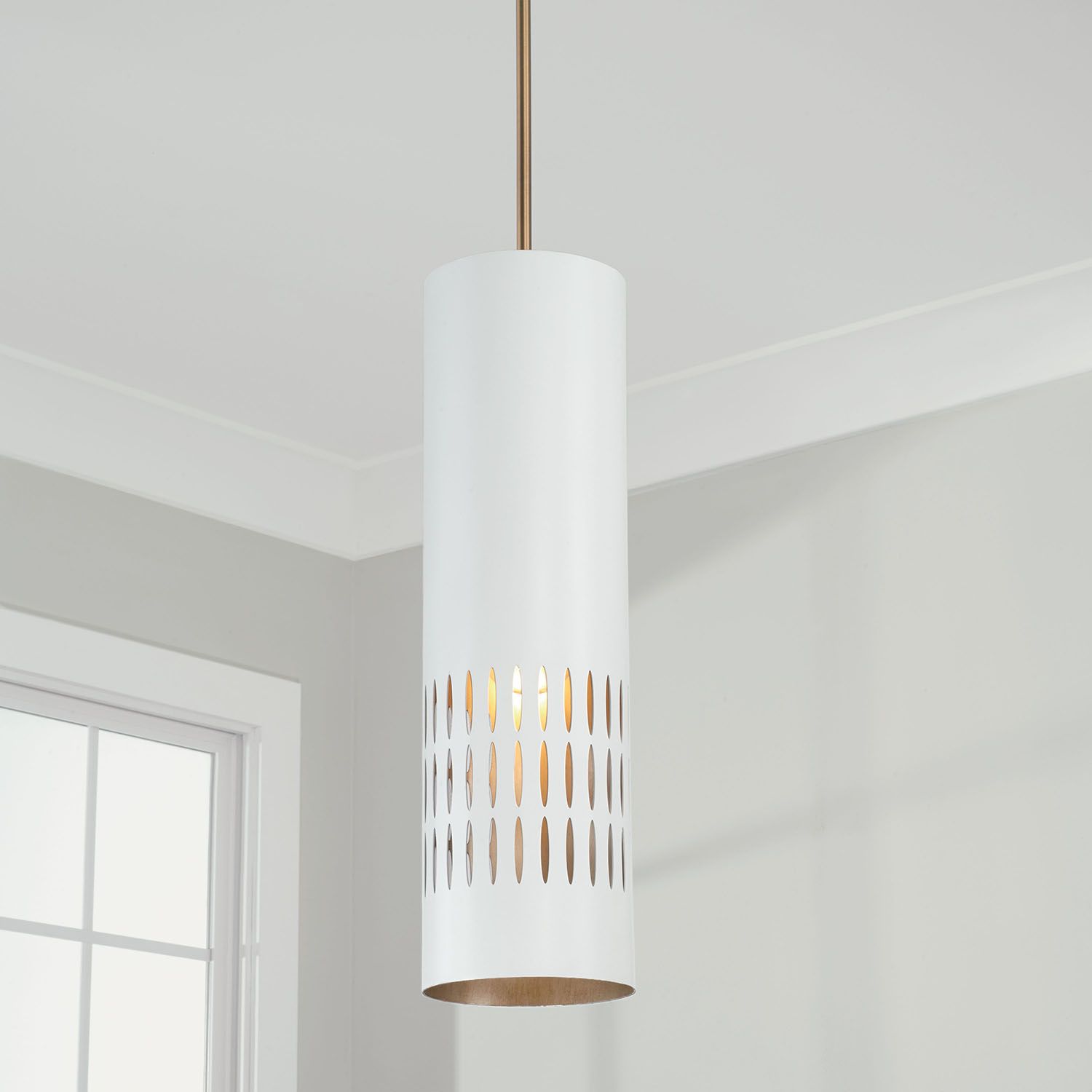 Mid-century style meets modern metal in the Dash Mini Pendant. Striking cut-outs create character against the smooth White finish, and the Painted Aged Brass finish on the interior of the metal shades paints a warm backdrop, adding dimension for standout style.