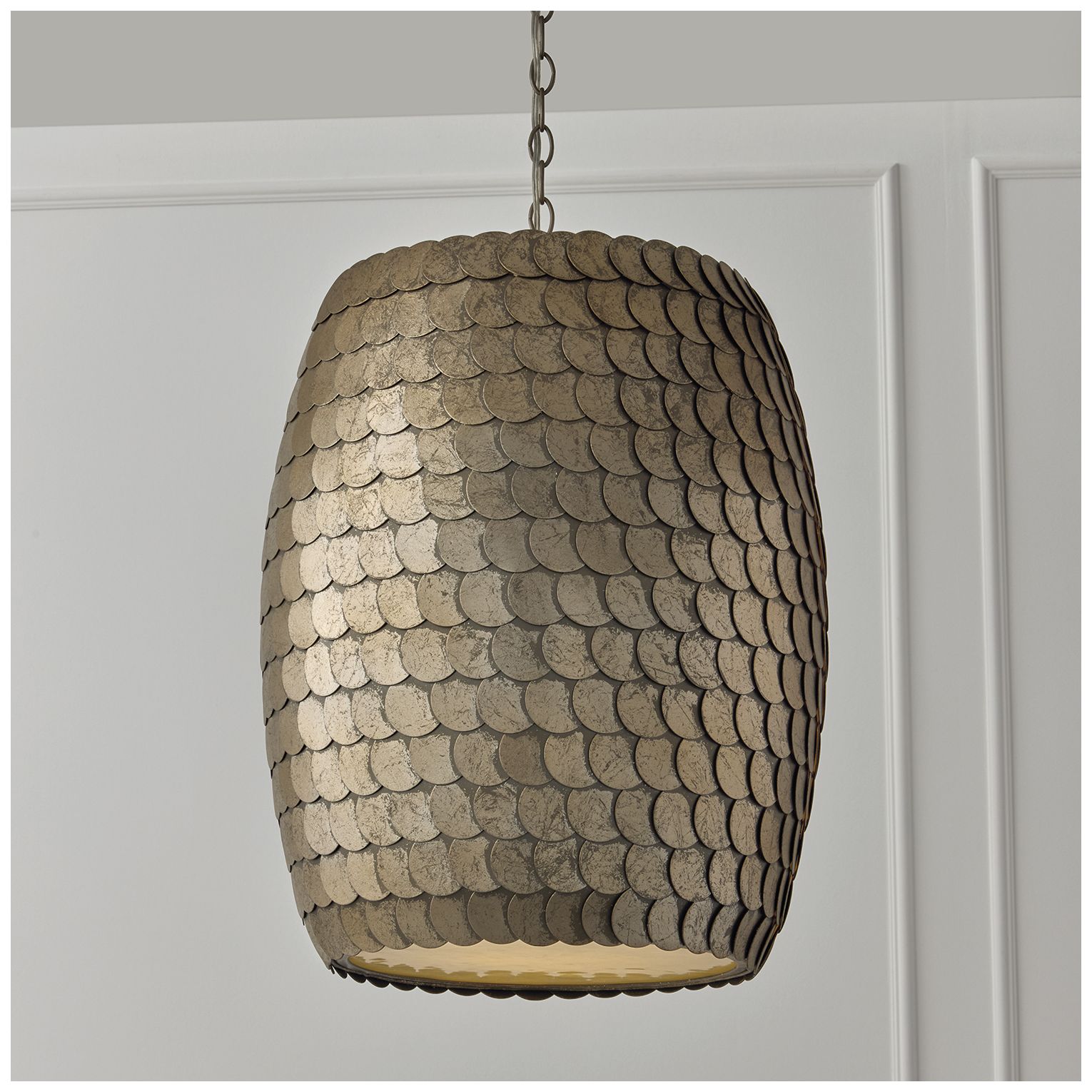 Handcrafted overlapping metal discs bring stunning texture to the Delphine 15 inch Medium Pendant. Each disc beautifully attracts the light in its own way, creating a sense of motion on the curved cylindrical silhouette. The Grecian Pewter finish adds visual dimension, while the real Alabaster diffuser illuminates a soft, natural glow.