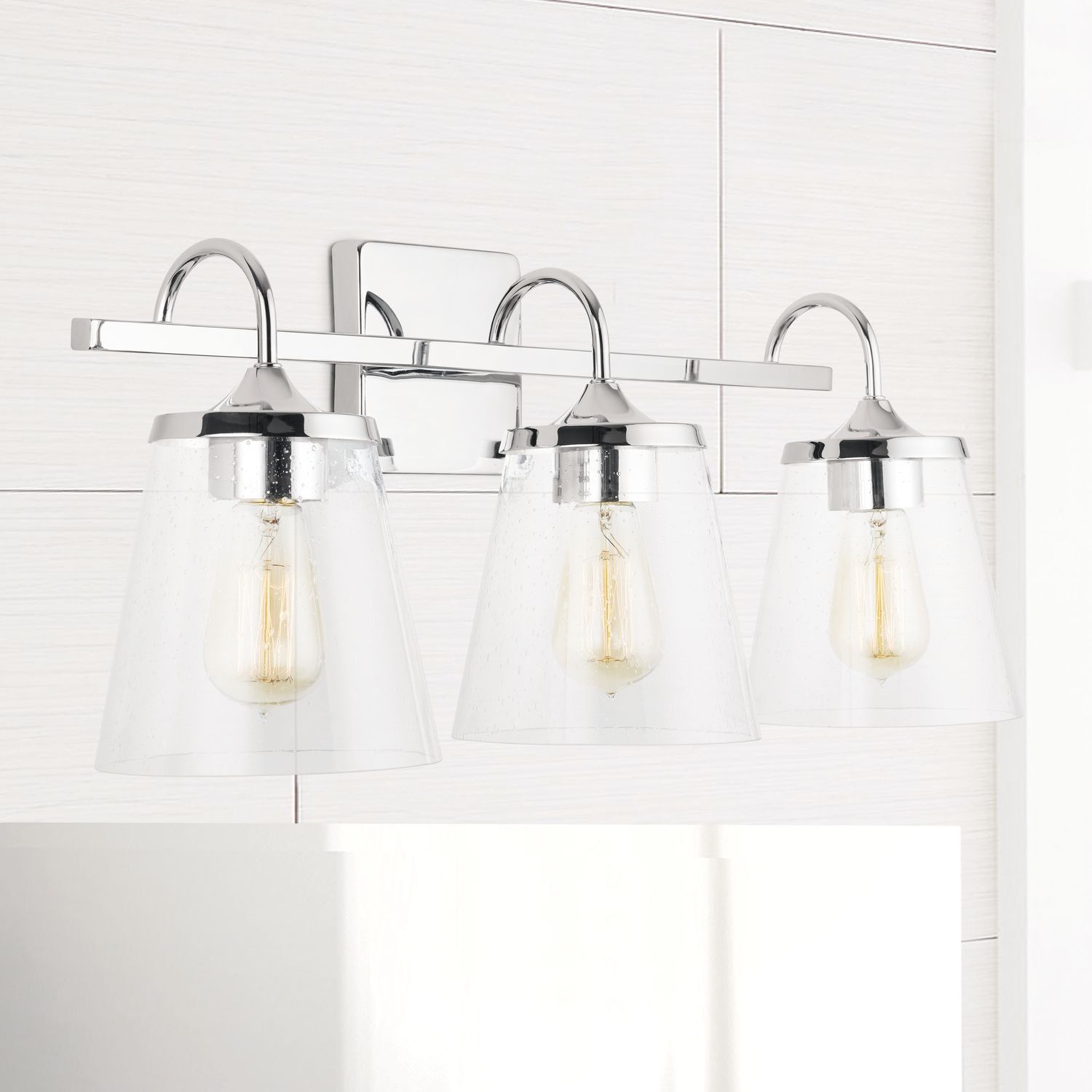 The wide cone seeded glass on this 3-Light Vanity is suspended by a simple arched arm and tapered metal cap makes it a timeless shape for any bathroom vanity.
