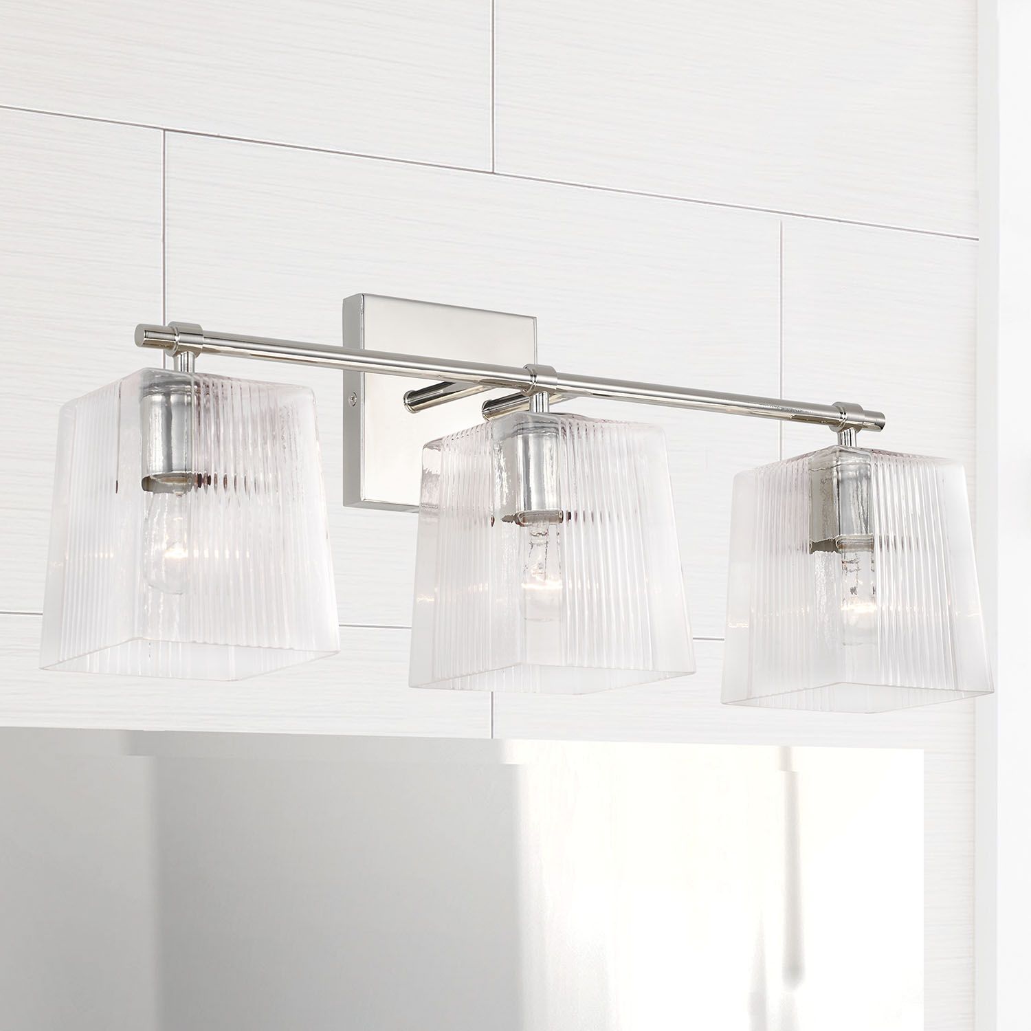 The chic fluted details on the Lexi 3-Light Vanity create character and visual interest. The tapered square glass shades sparkle, are accented by a sleek, Polished Nickel frame. These fixtures are available as a 2-light or 3-light.