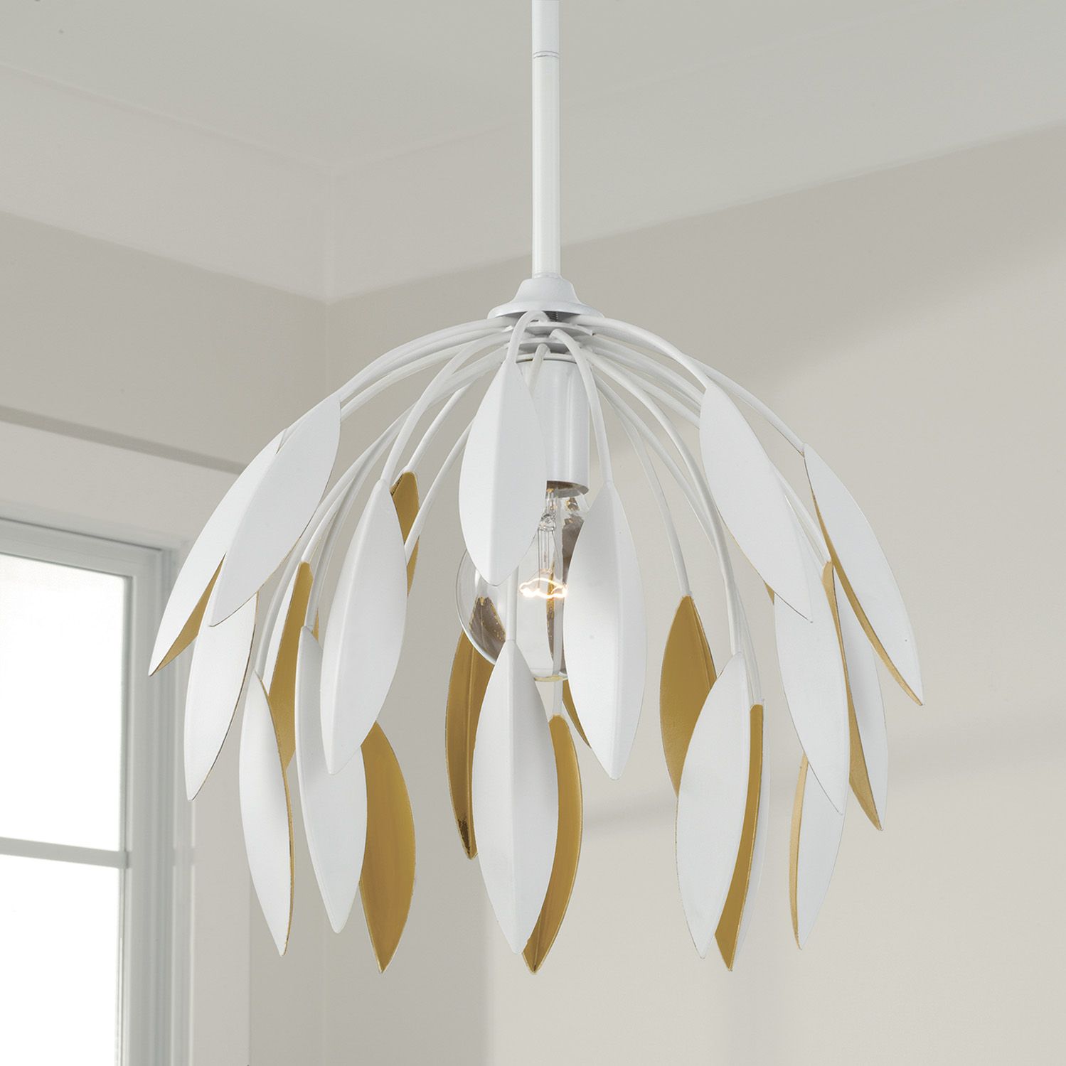 Whether hung as a pendant or semi-flush, the Margeaux Dual Mount brings the glamour. Layers of cascading leaves create decadent dimension, while the Matte White finish with Buffed Gold interior invites visual intrigue from every angle.