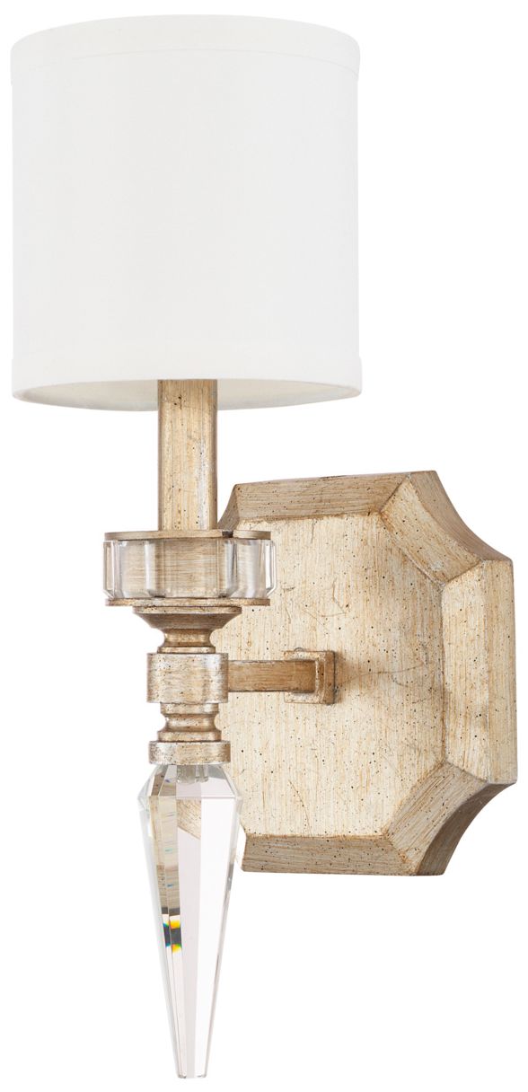 Glistening K9 crystal gives our Olivia 1-light sconce its chic sparkle, perfectly accented by the crisp white fabric shade. Finished in Winter Gold, which brings together elements of silver and gold for a fresh, modern appeal, the design adds a glamorous update in traditional homes, perfect for hallways, staircases and foyers. Damp rated, it's also a great choice for bath and powder rooms.