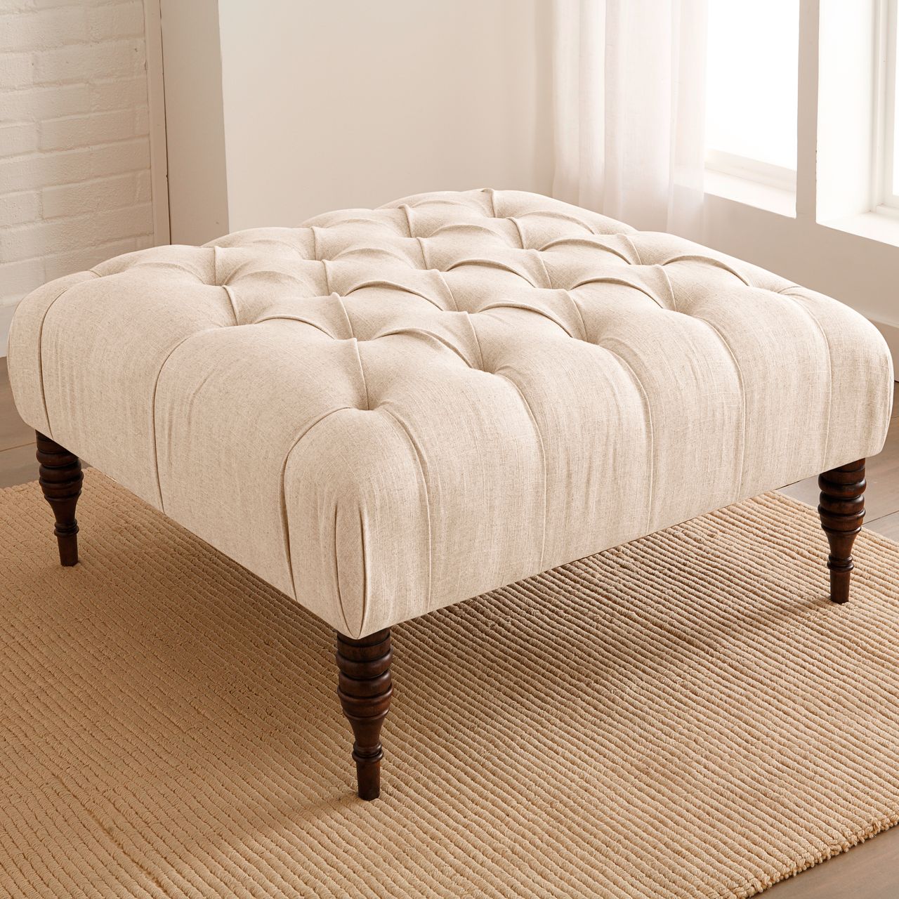 A versatile design that doubles as a coffee table, this traditional cocktail ottoman is a lovely update to your sitting area. It shows off a beautifully tufted top that's hand-crafted, while ornate turned legs add depth and dimension to its square silhouette. Off-white talc linen fabric adds texture and a rich, classical touch. The ottoman is crafted with a solid wood frame and is made in the USA to ensure the highest quality.