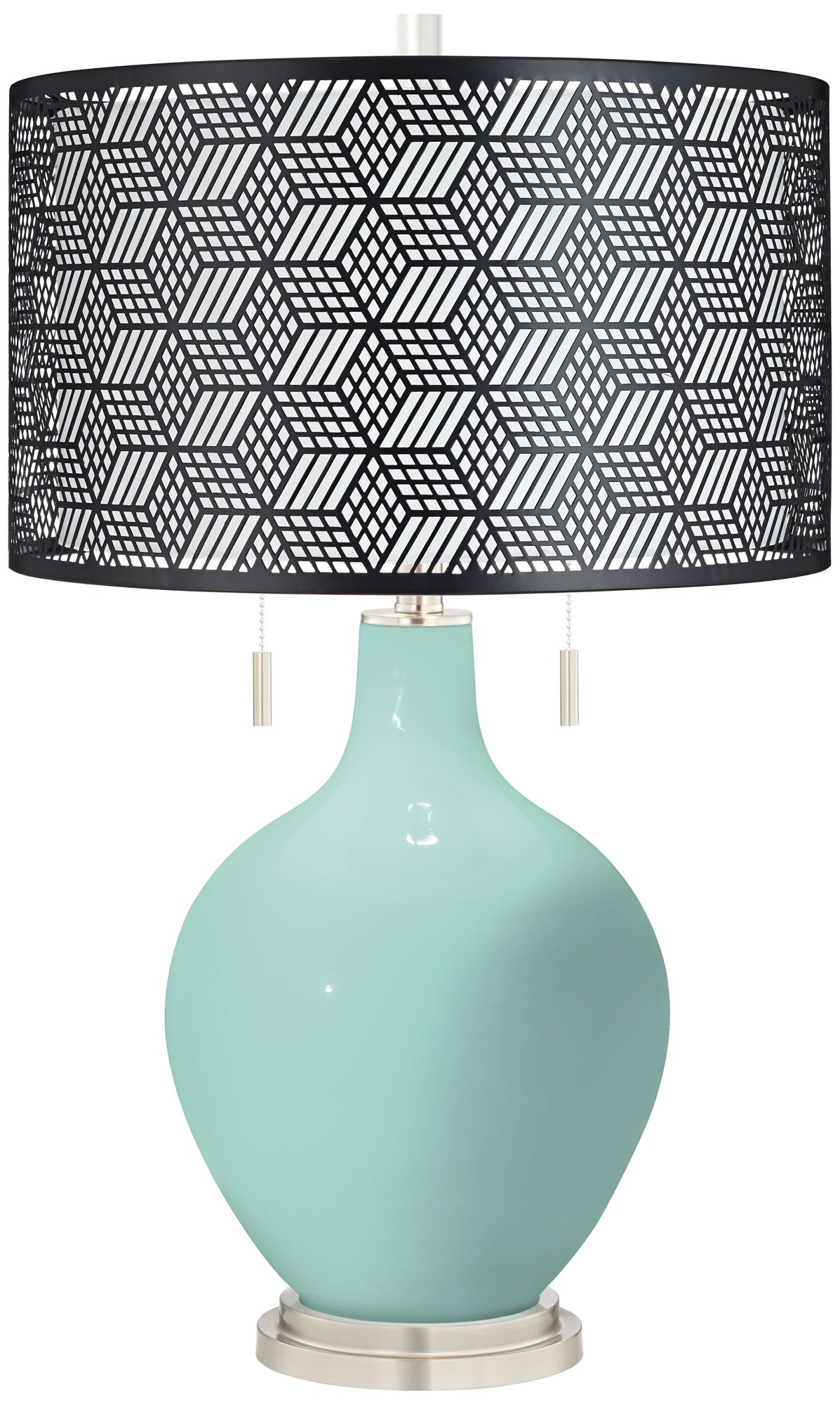 Bring exquisite style and designer color home with the Toby Color + Plus™ table lamp in beautiful Cay. The design is hand-crafted by experienced artisans in California, and is completed by a brushed nickel finish base and pull chains. A black metal drum shade sits on top, drawing the look together in contemporary style. Lamp base U.S. Patent # 8,899,798.