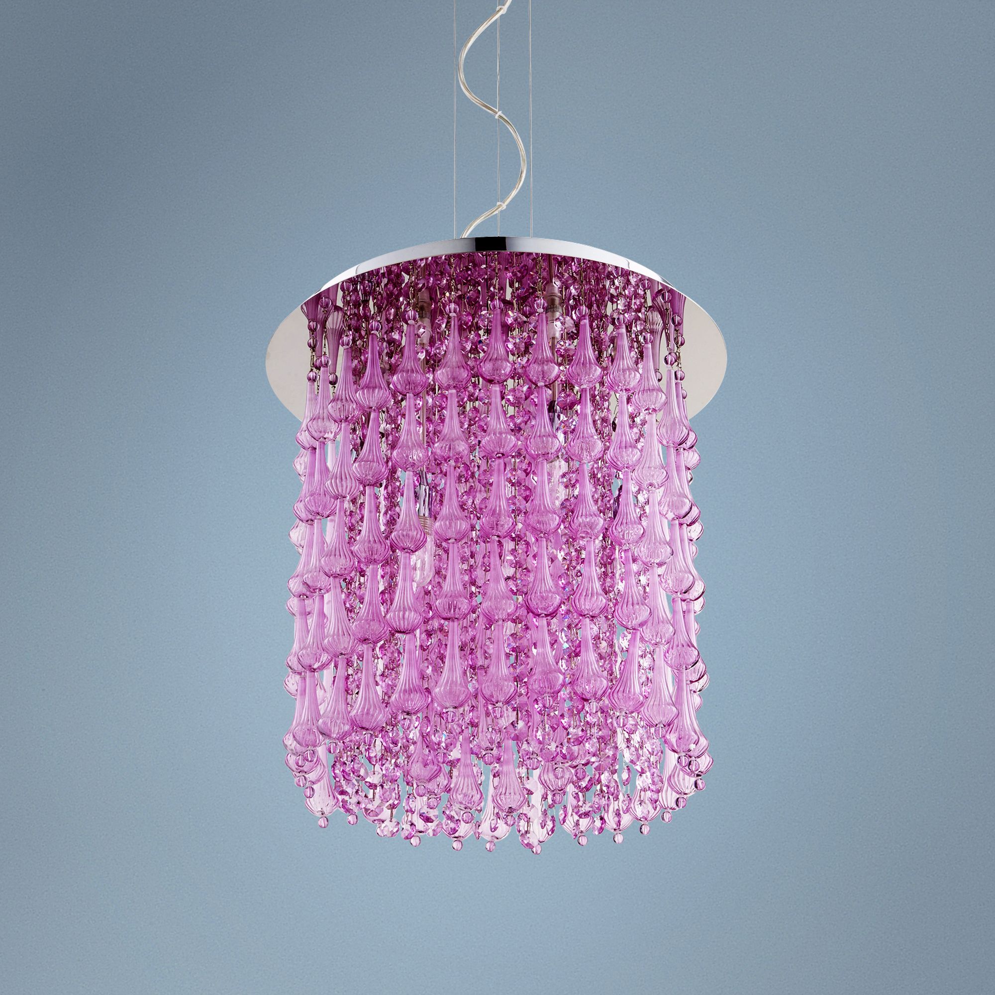 The Charleston Collection brings you this whimsical iron pendant without sacrificing true contemporary style. A copious cascade of vibrantly colored glass drops fall to add style whether on or off. A clean halogen bulb intensifies the color play for extra sparkle. A great design uplift to any space.