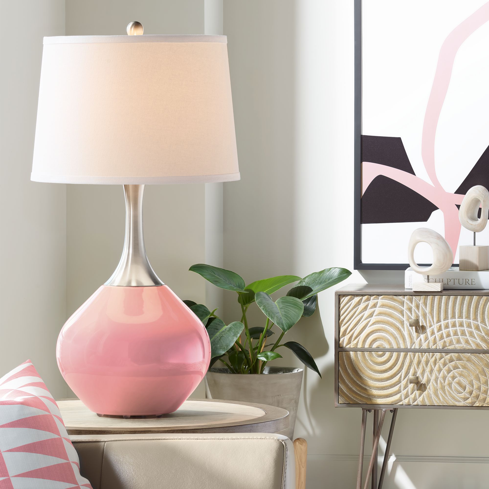 The Spencer Color + Plus™ table lamp is an exquisite home style upgrade. Hand-crafted by experienced artisans in California, the base features a beautiful Haute Pink color tone that is elegantly complemented by a graceful metal lamp neck in brushed nickel finish. A coordinating finial over the plain white tapered drum shade draws the look together and completes the design. Lamp base U.S. Patent # 8,899,798.