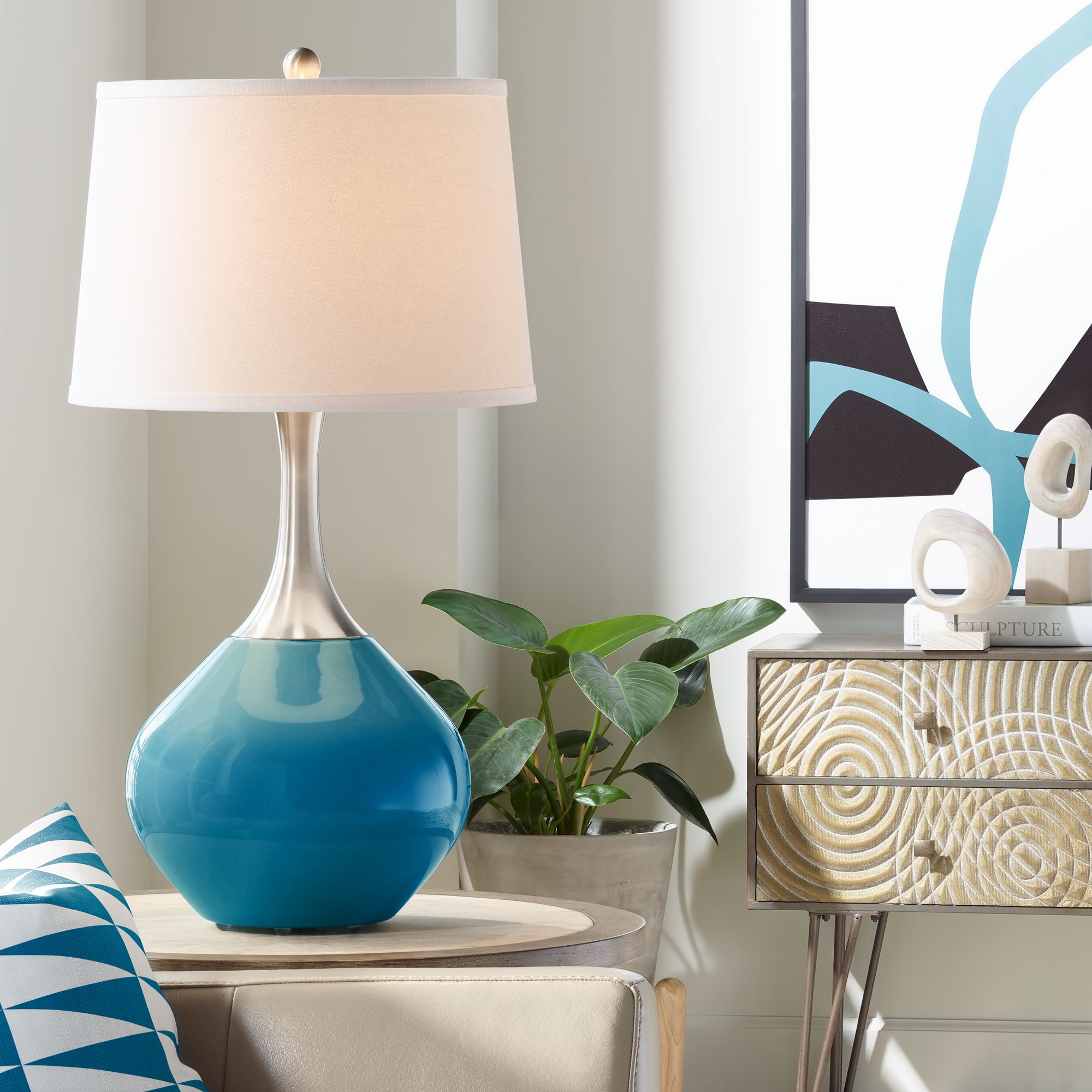 Find your color with the Color Plus brand of lighting. The modern Spencer table lamp from the brand is seen here in a cool Mykonos Blue color inspired by peaceful Mediterranean ocean waters. The blue is complemented by a graceful metal lamp neck in brushed nickel finish. A coordinating finial and a white fabric tapered drum shade draws the look together. The easy way to add designer style to your home decorating.