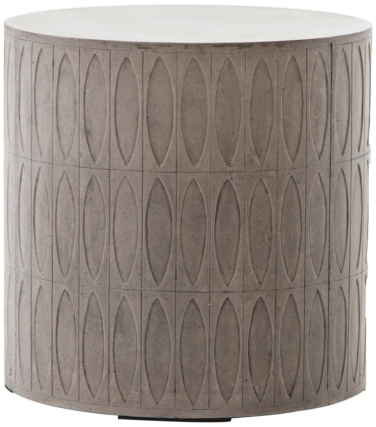 Concrete adopts alluring shapes as modern geometrics play with Mother Nature's petal forms in this drum outdoor end table. A hollowed drum of dark gray concrete is intricately etched for artistic intrigue whether indoors or out. Cover or store indoors during inclement weather or when not in use.