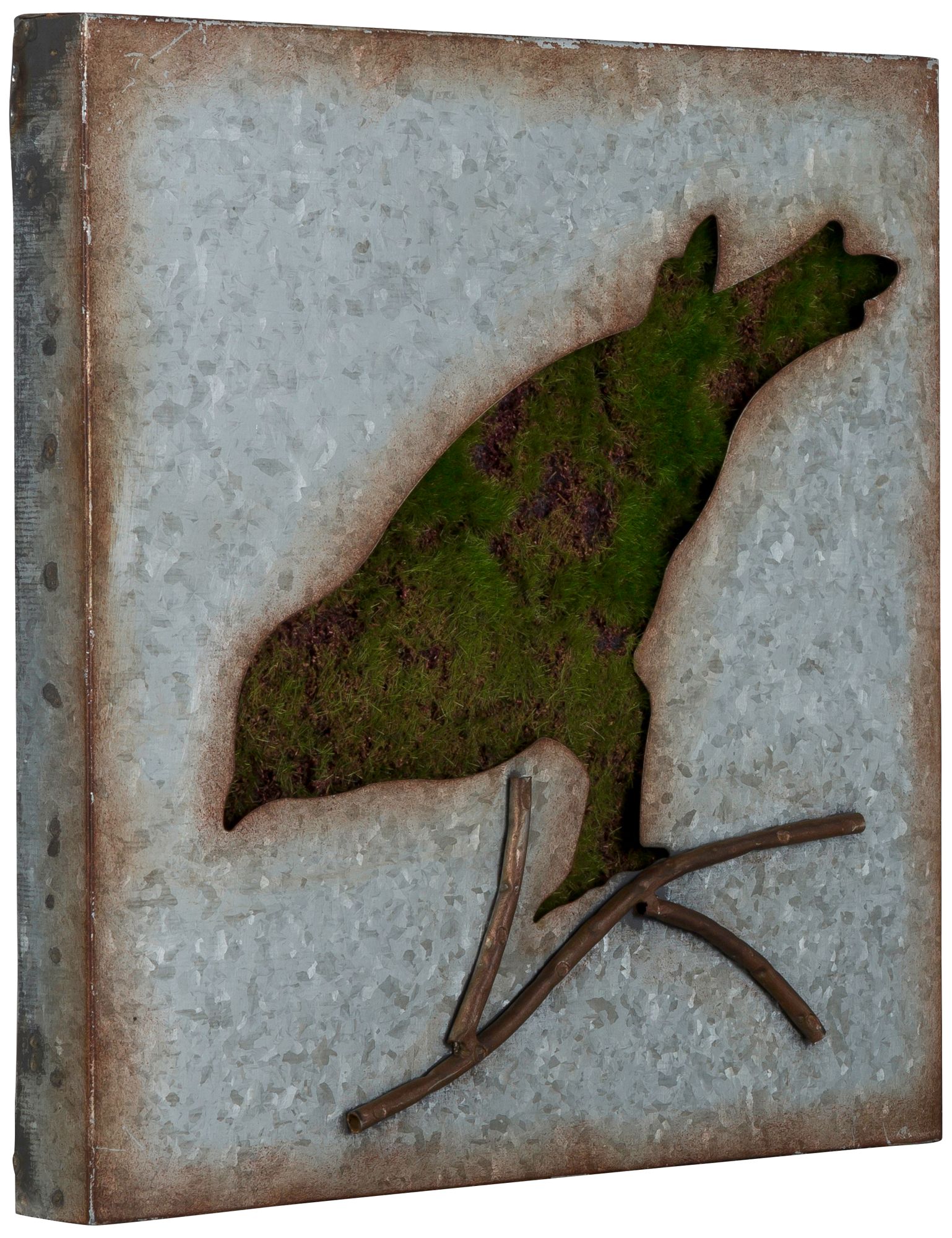 Created in an unusual combination of galvanized metal with green artificial grass this wall art immediately upgrades any casual room in the home. This square wall art piece adds texture and intrigue to the decor. From Cooper Classic, this bird on a branch wall art design is ready to hang.