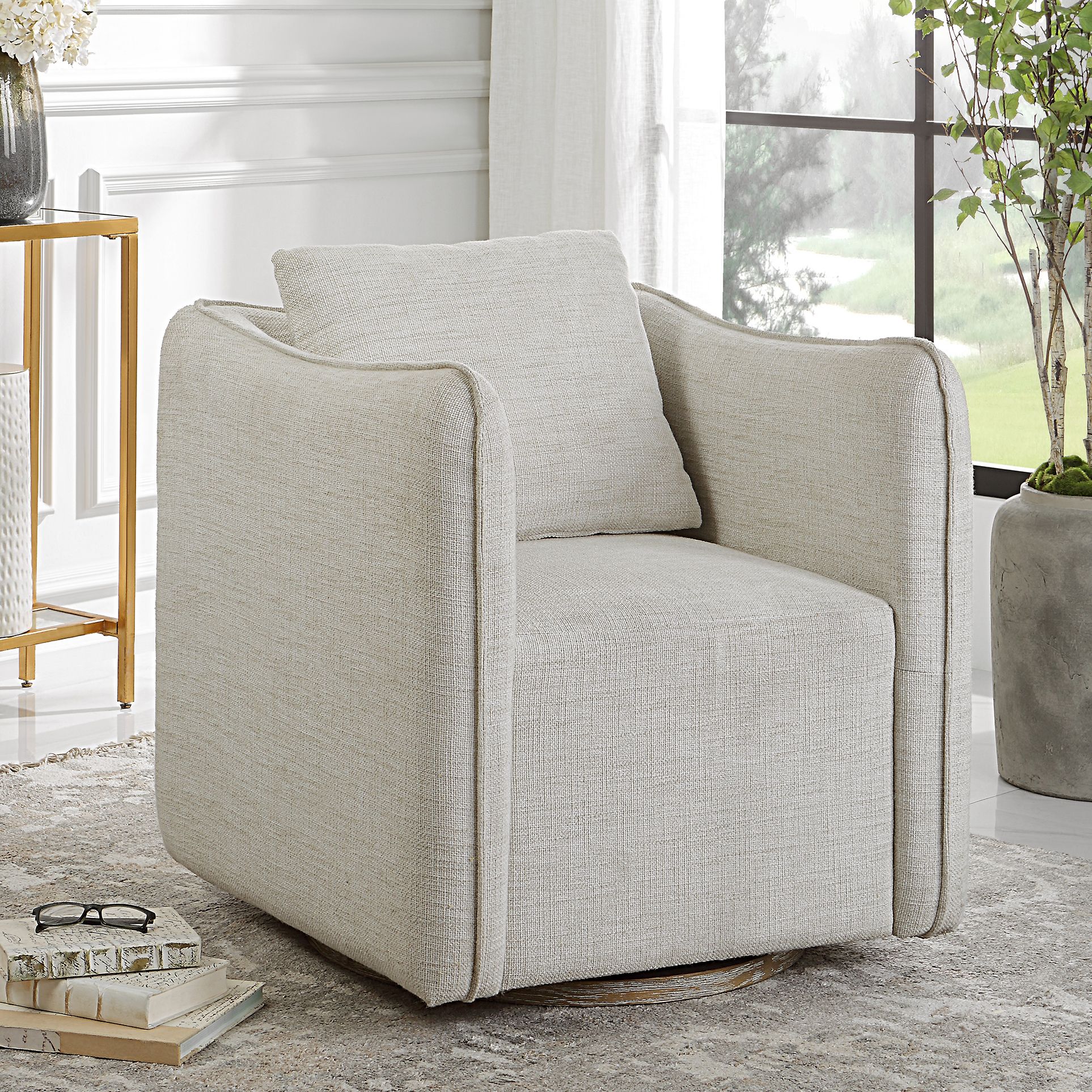 A contemporary swivel chair, covered in off-white woven linen-blend fabric, and shelter arms embracing a loose back pillow with elegant flanged edges.
