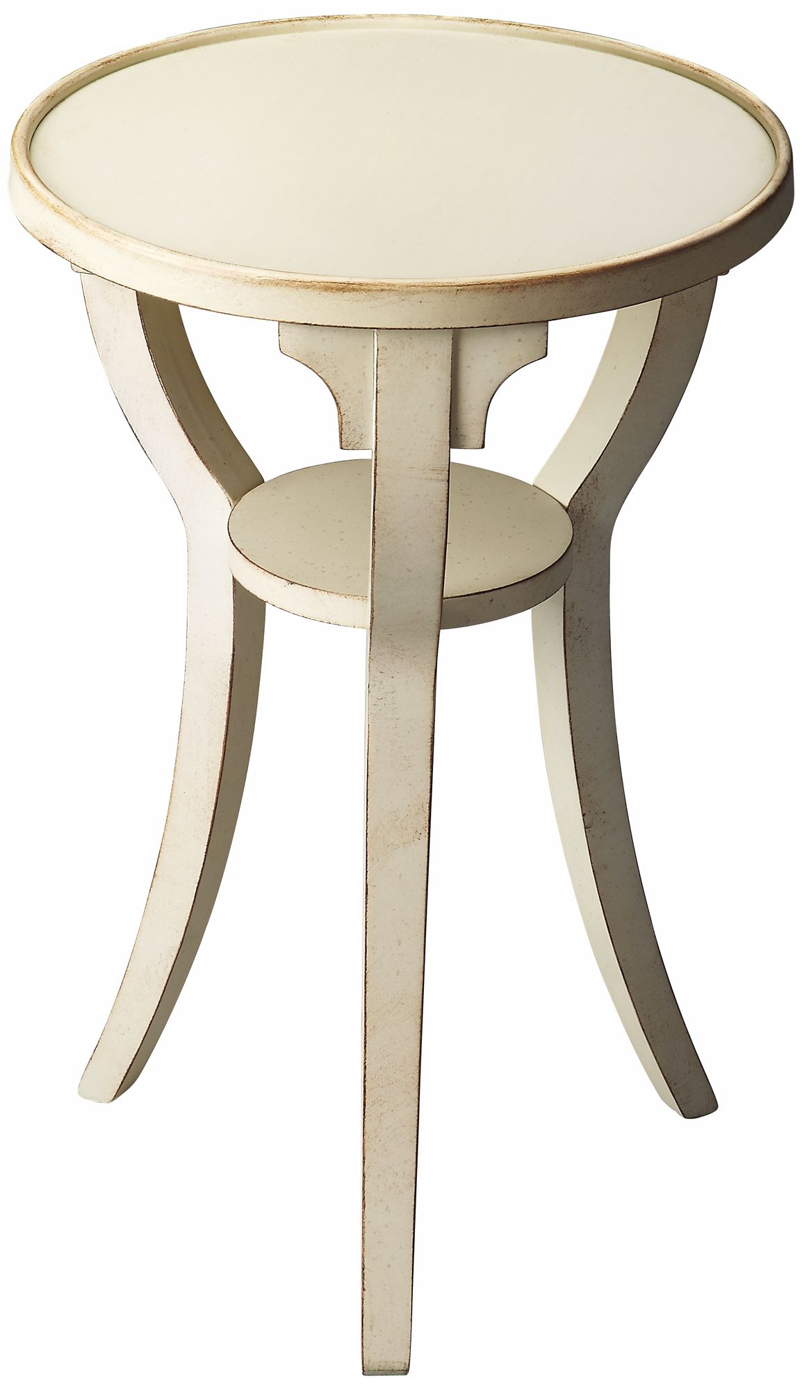 Simple, casual style is embodied in this wood accent table in a creamy, cottage white finish with exposed wood rub-through edges. The round top is echoed by the lower accessory shelf. Beautiful curved legs bring an additional decorative element to this wonderful home accessory. Assembly required.