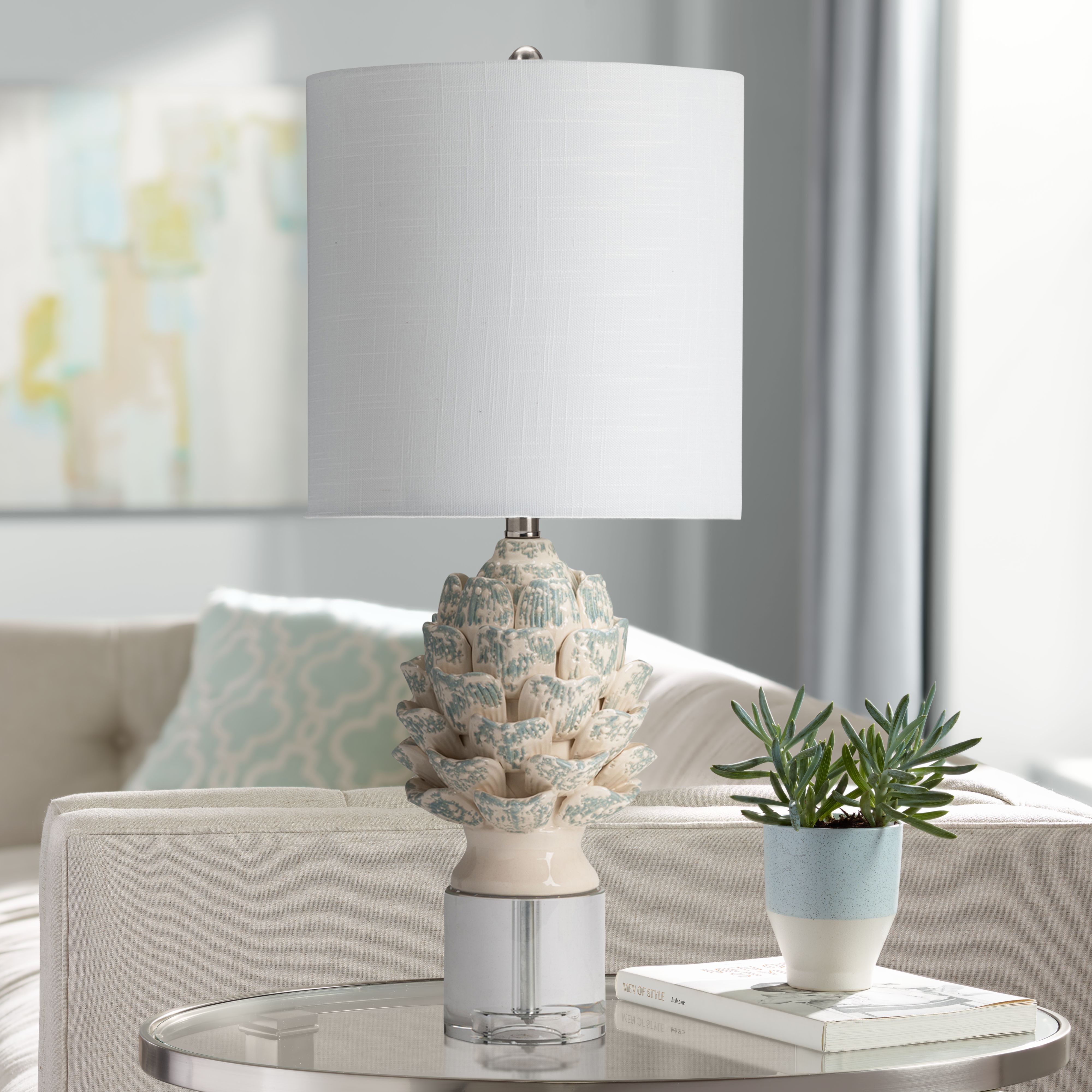 - Antique cream finish with blue details over ceramic construction. White linen cylinder shade.