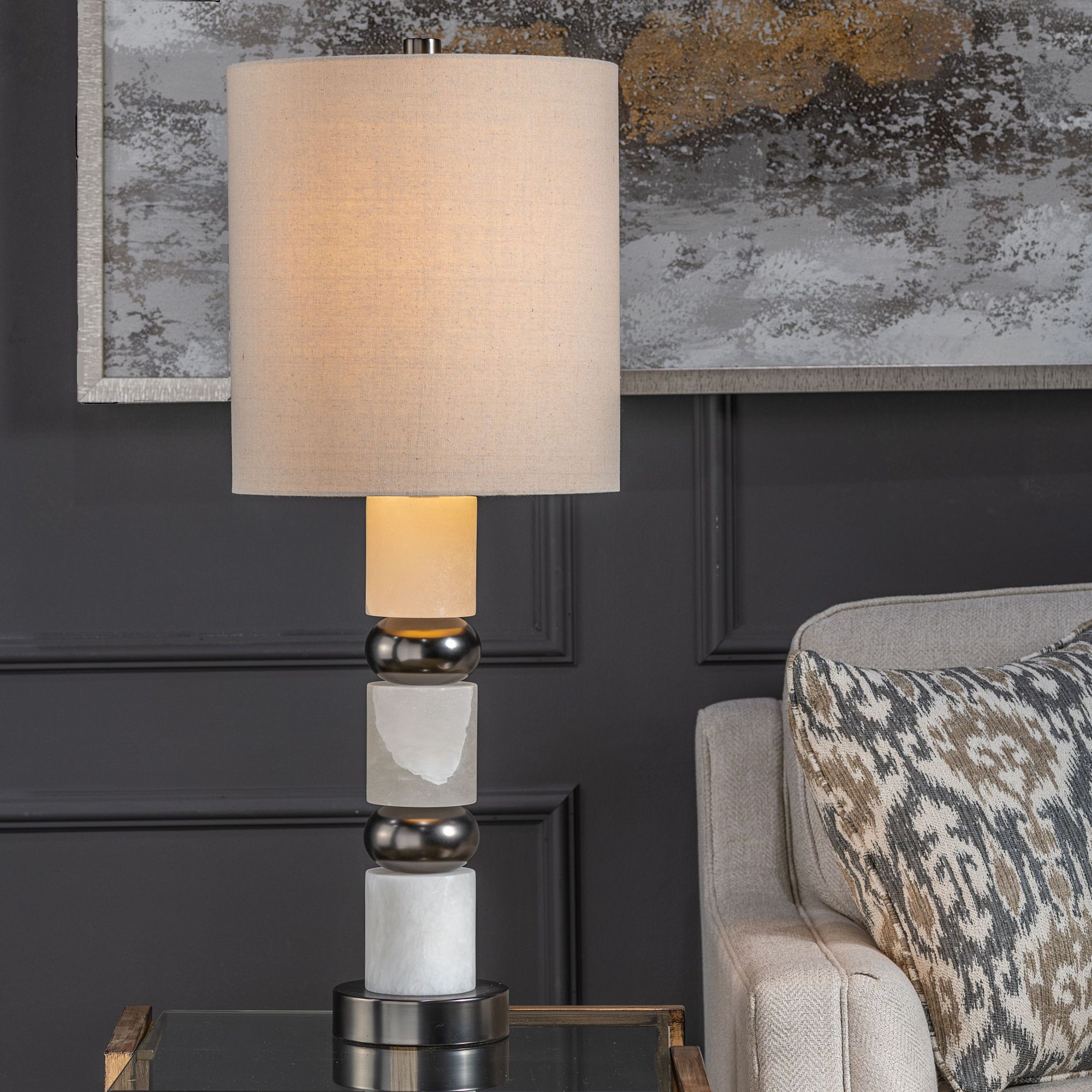 From Crestview Collection, this contemporary table lamp exudes refinement and style. It is composed of a series of alabaster cylinder blocks stacked on top of one another, with rounded metal accents acting as separators. On top is a tan cylinder shade that provides a handsome finishing touch to this modern design.