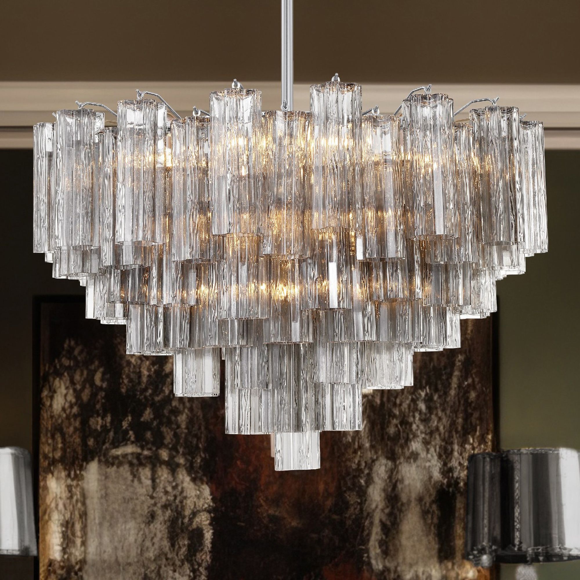 The captivating Addis Lighting is a modern-day interpretation of the iconic mid-century Tronchi chandelier. Inspired by its predecessor's sleek lines and geometric shapes, the Addis features a Polished Chrome or Aged Brass metal frame that exudes sophistication and style. Its unique design showcases transparent tiers of textured Tronchi glass tubes, forming a mesmerizing 5-point rounded star shape. Choose from a range of glass colors, including clear, amber, smoke, and white, or the stunning Autumn and Spring options, which feature a captivating multicolor disposition. The Addis Collection offers various sizes and finishes, allowing you to find the perfect fit for your space while adding a touch of timeless elegance.