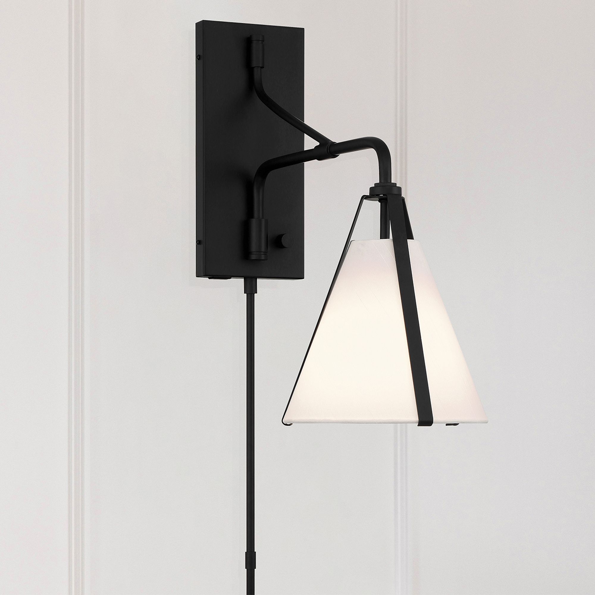 The tailored and versatile Fulton wall sconce arm moves left and right with contrasting materials to create an eye-catching display. This fixture features a tapered shade wrapped in a metal ring with tailored lines creating an elegant contrast that illuminates downwards. Finishes include Polished Nickel, Antique Gold and Black.