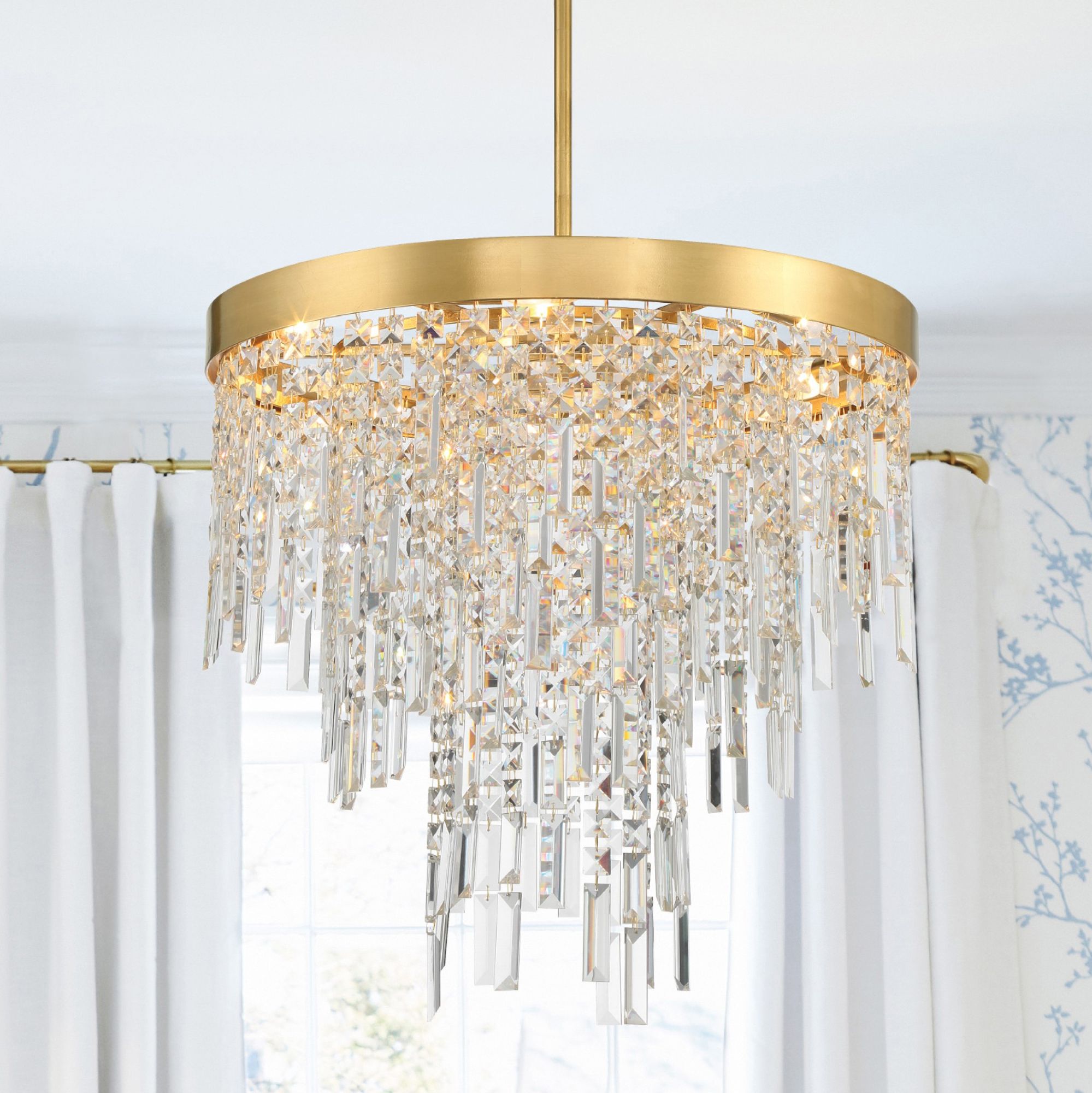 The Winfield collection's artful elegance and inspiring beauty make a sophisticated statement to an interior. This exquisite collection showcases square and rectangular multi hand cut crystal strands gracefully hanging from its metal frame. These mesmerizing crystals sparkle and reflect light, creating a dazzling display that captures attention and adds a touch of opulence to any space. Whether illuminated or not, its eye-catching presence becomes a focal point in any room.