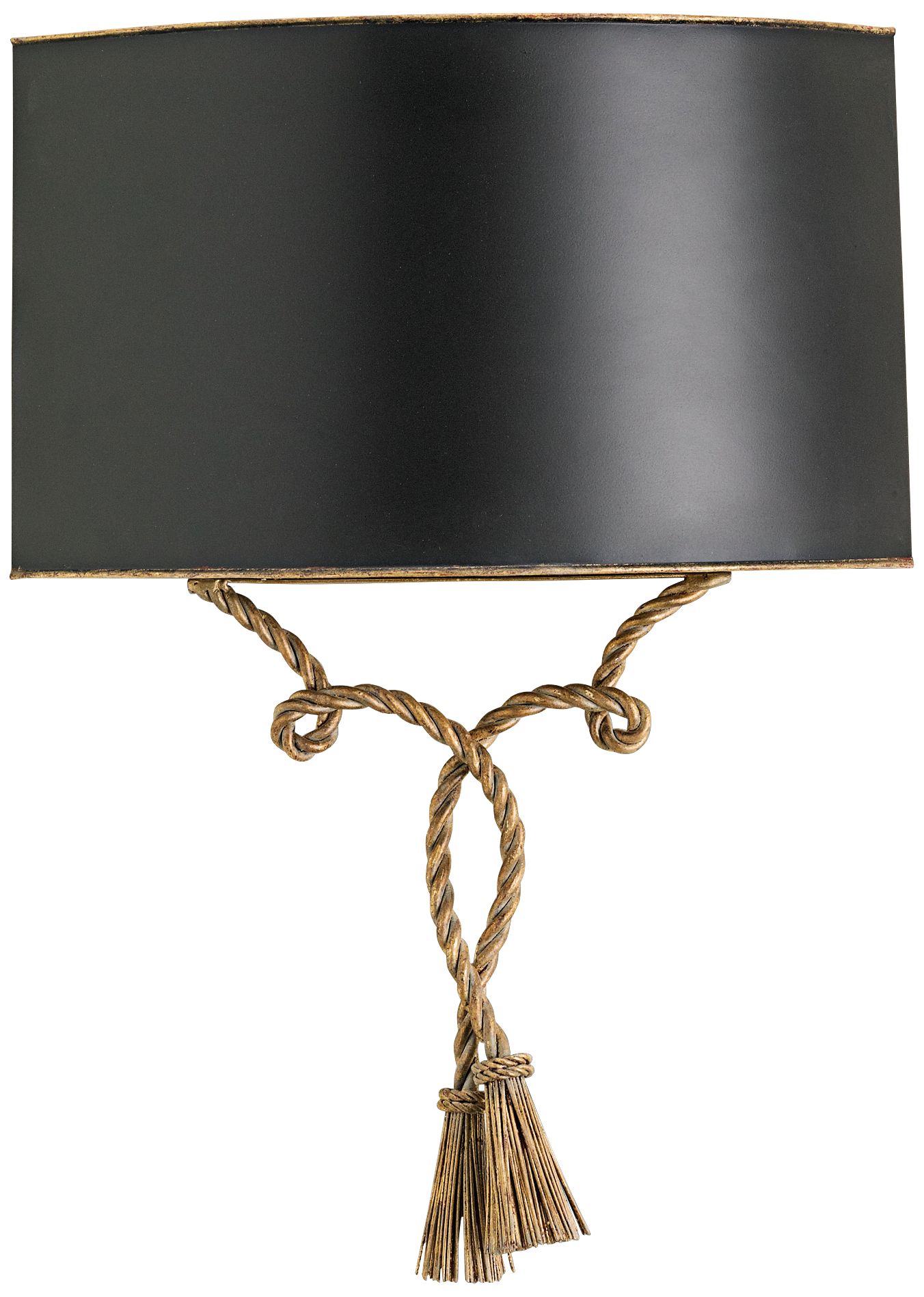 This simple yet alluring wrought iron wall sconce has the look of a natural rope accent design, finished in two types of hand-rubbed gold leaf. A black finish metal shade tops this ADA compliant design that features a single light. A beautiful Currey and Company lighting design.