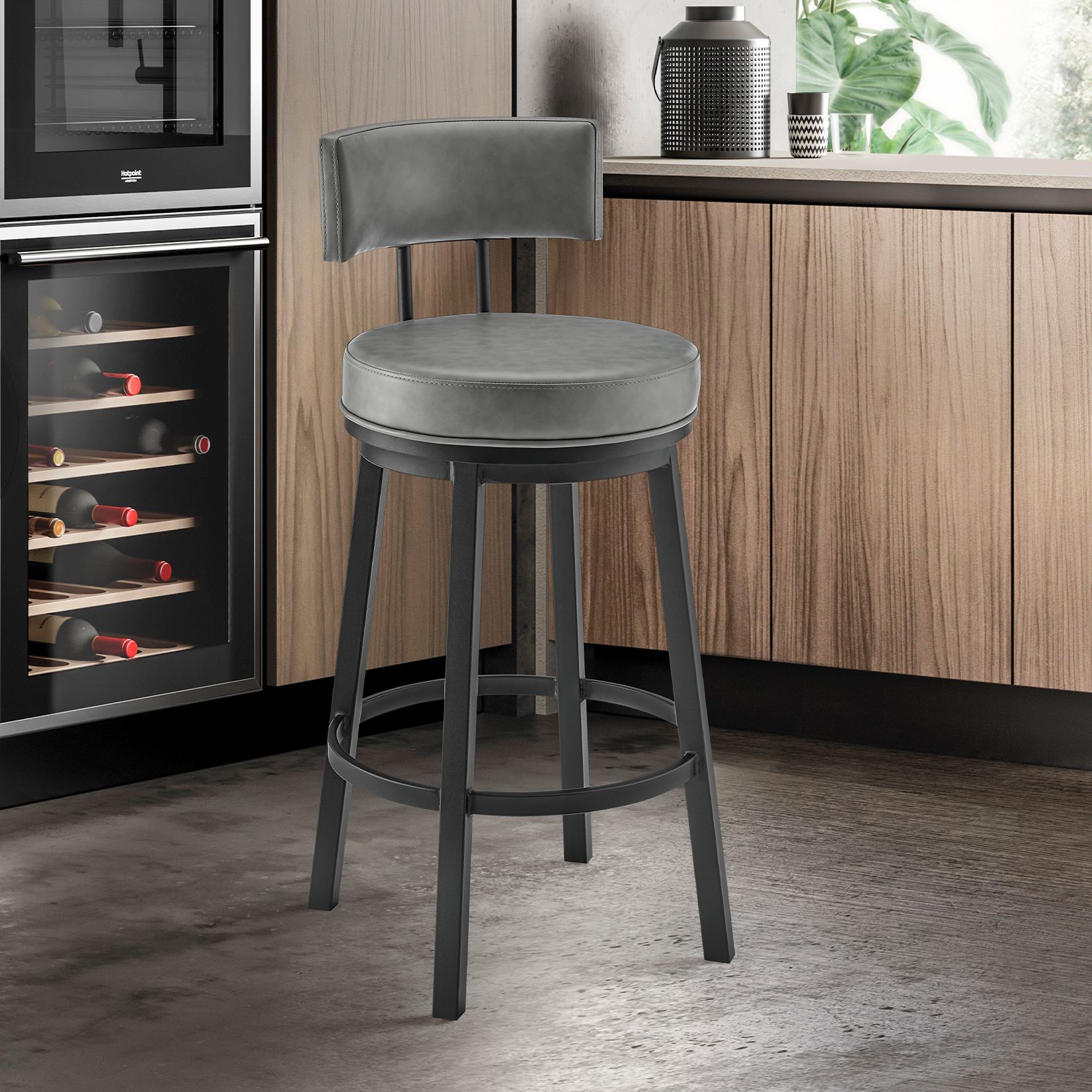 Dalza 30 in. Swivel Barstool in Black Finish with Grey Faux Leather