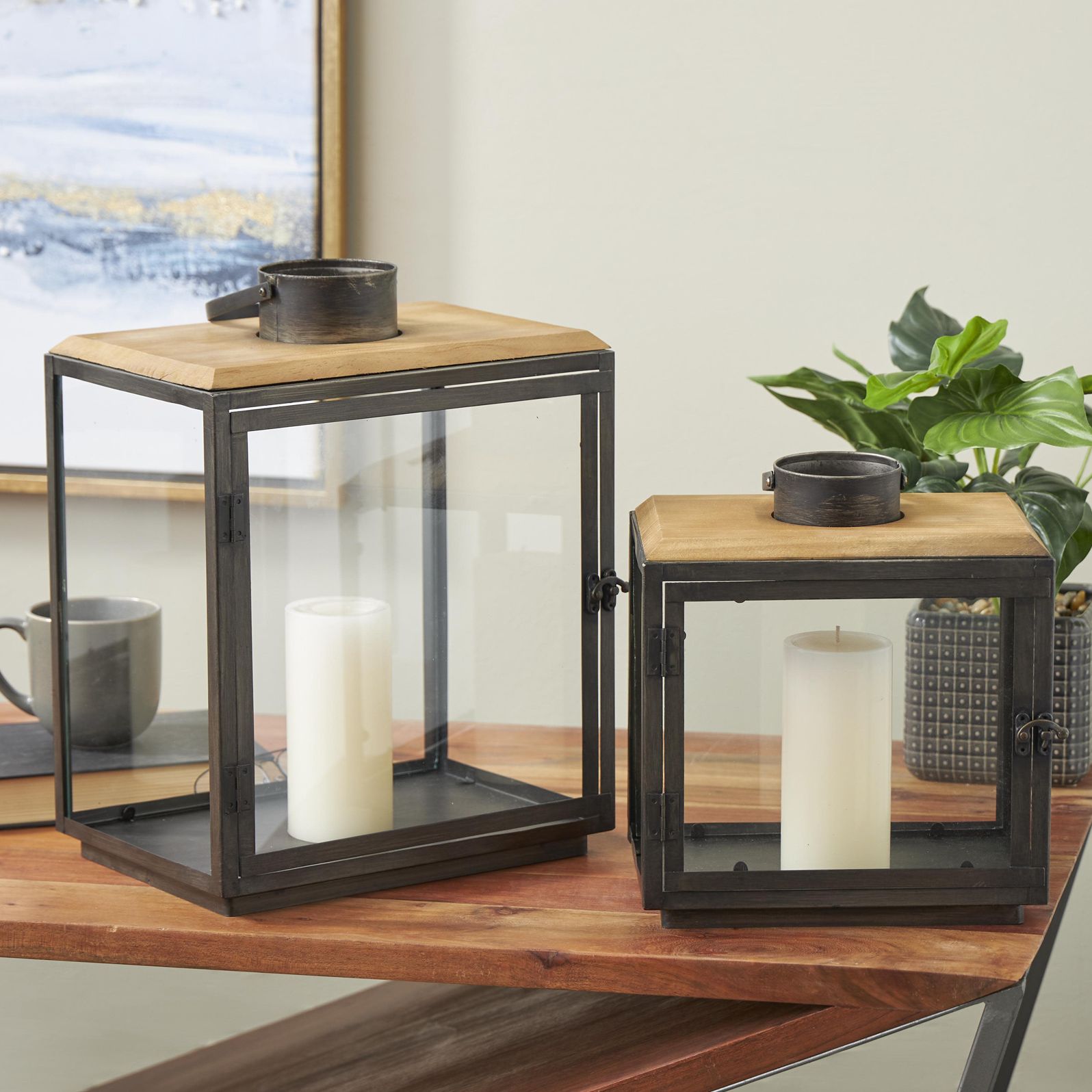 Dark Gray Metal Industrial Candle Lantern, S/2 15", 11"H