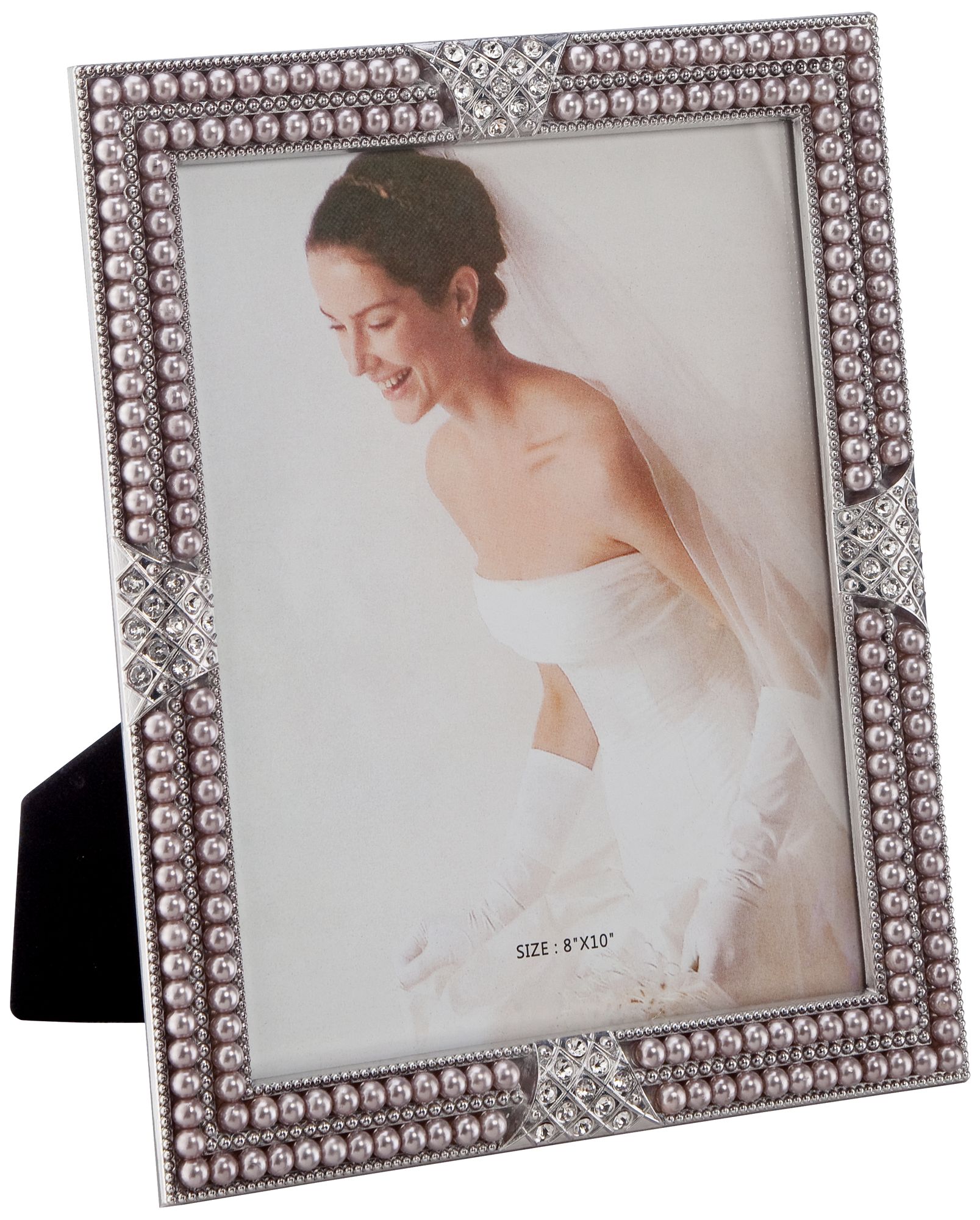 Dark silver pearls and rhinestones bring a beautifully feminine look to this rectangular picture frame. The look is elegant and soft - perfect for showcasing wedding or bridal photos. Displays one 8x10 photograph (not included).