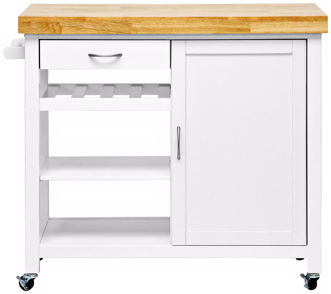This attractive kitchen island cart adds plentiful space for cooking and storage. Modern white design features one drawer, open storage, and space behind a door. A solid wood butcher block countertop offers a large, easy to clean surface for preparing food and serving. Also features a side towel bar and locking casters. Assembly required.