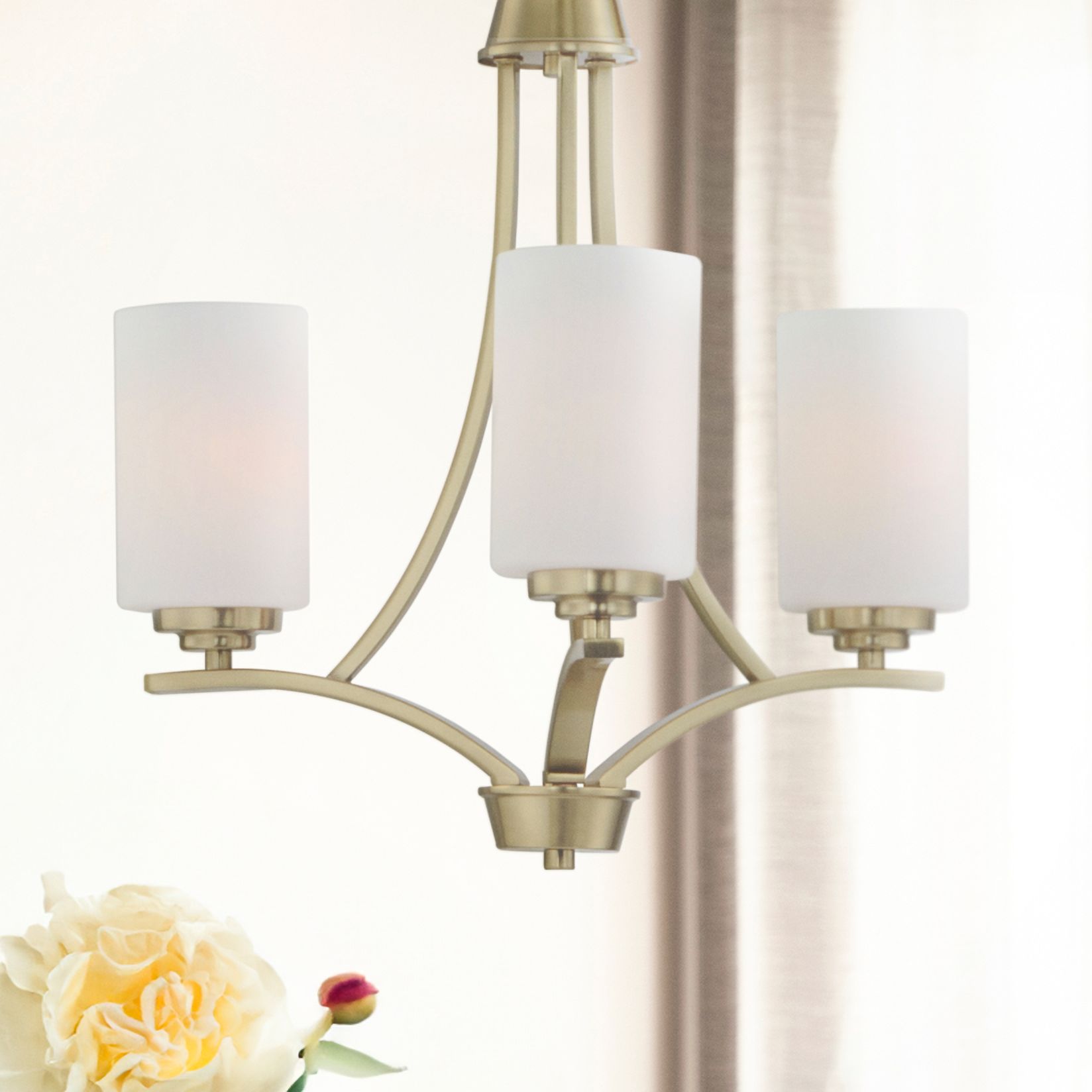 Low sloping arms of rectilinear tubing is finished in a variety of options that include Satin Nickel, Oil Rubbed Bronze, Matte Black, and a contemporary Satin Brass finish. Tall, cylindrical Satin White glass shades soften the light source within. Offered in a variety of configurations that include chandeliers, sconces, and a semi-flush pendant that may be used as a foyer pendant, has become a proven popular choice among builders.