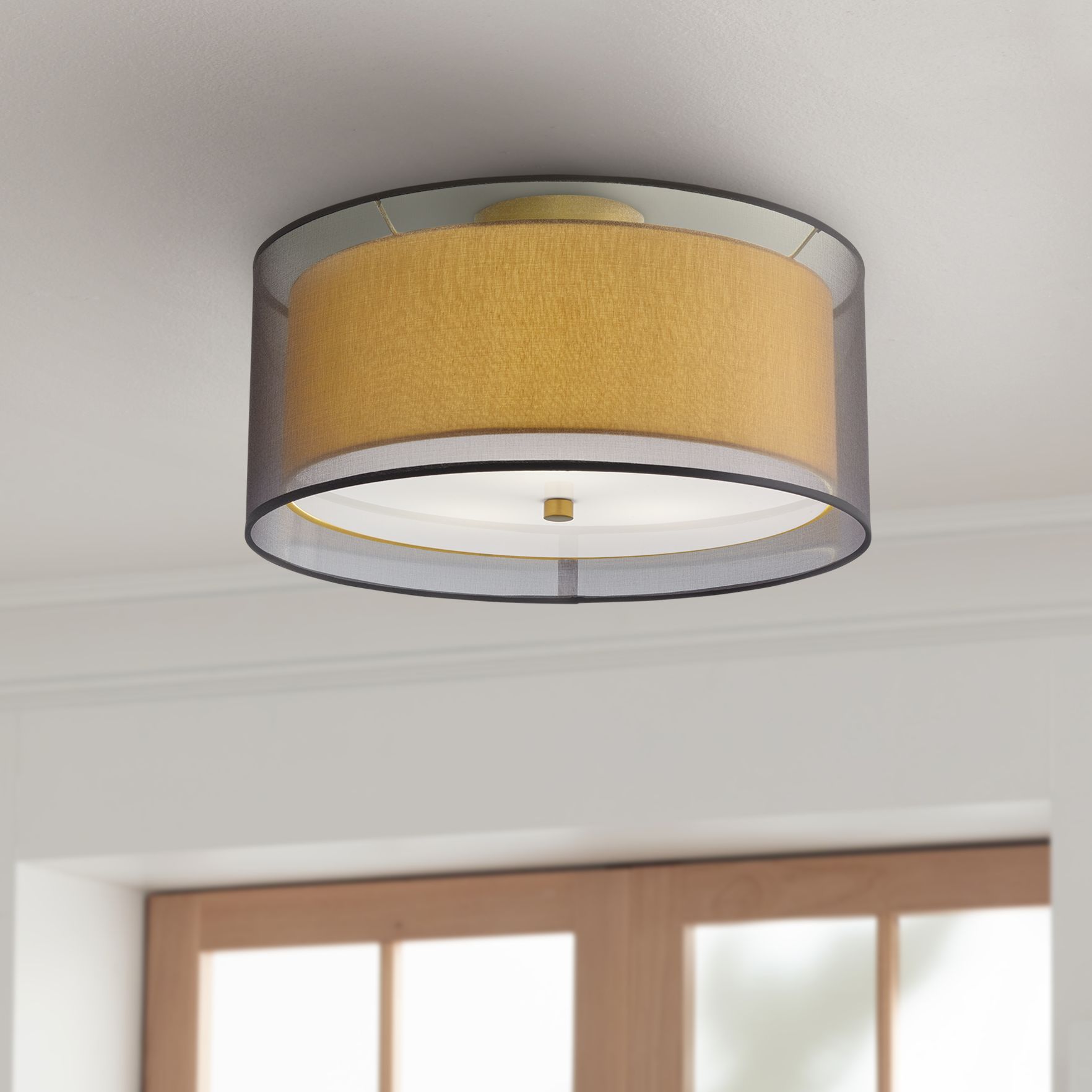This modern flushmount ceiling light design offers an elegant look for bedrooms, hallways and more. It features a double drum lamp shade look, with an inner shade surrounded by a sheer drum. A white diffuser at the bottom shields the bulbs from view and creates a more finished look. Three bulbs concealed behind the diffuser create a bright room accent.