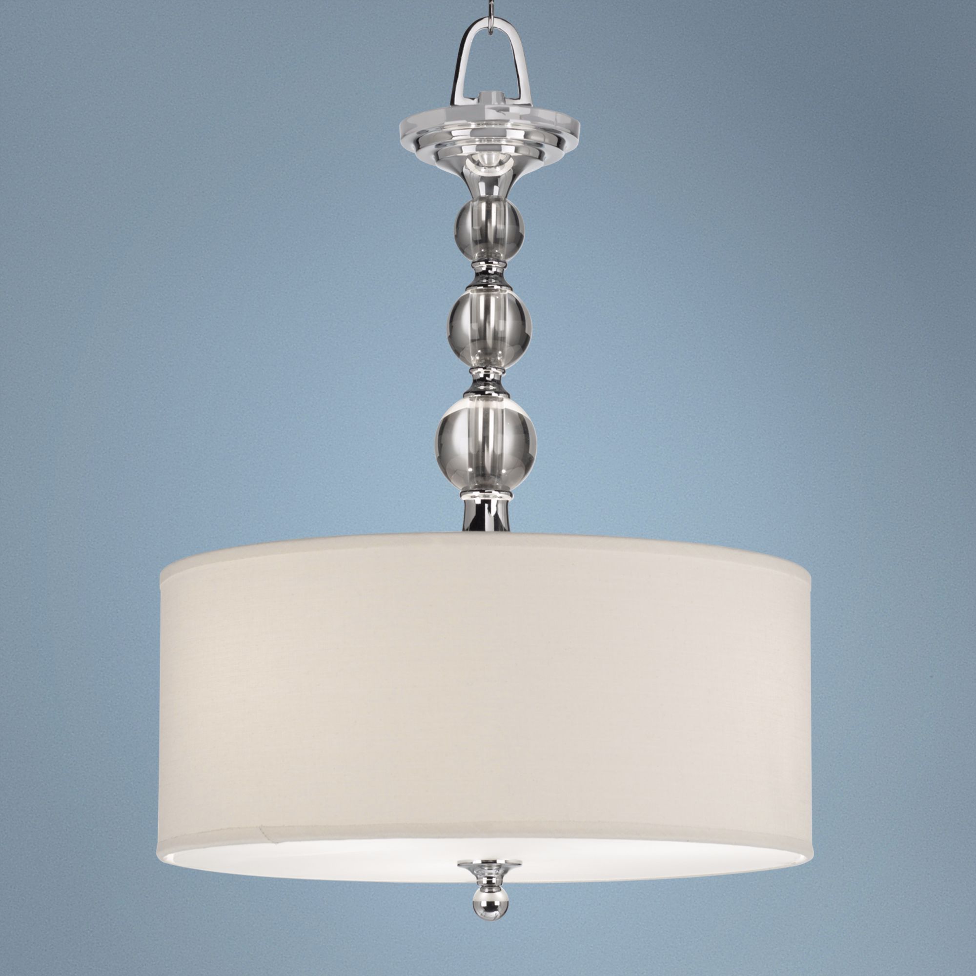 - Polished chrome finish; glass ball accents; cream linen shade.