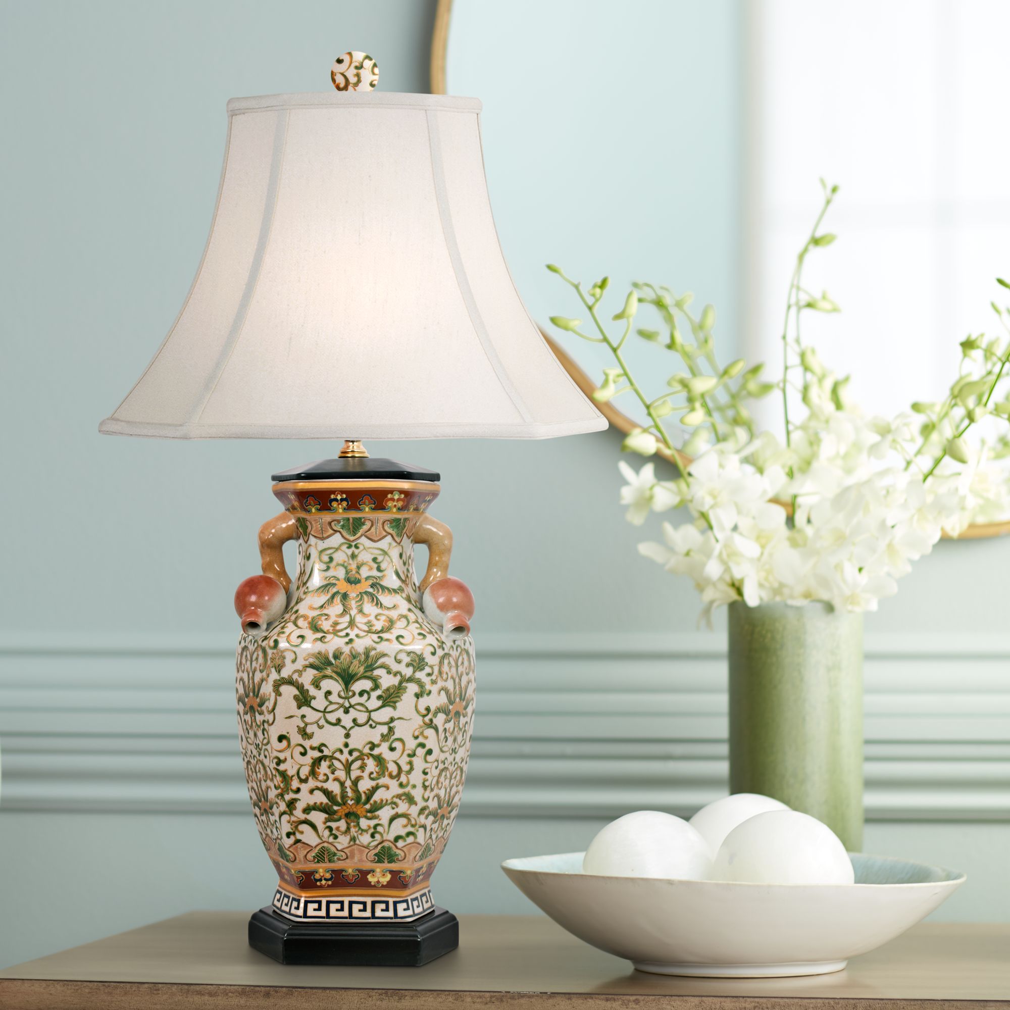 • Porcelain vase table lamp. Hand-painted garden and vine pattern in greens and multi-colors. Porcelain construction.