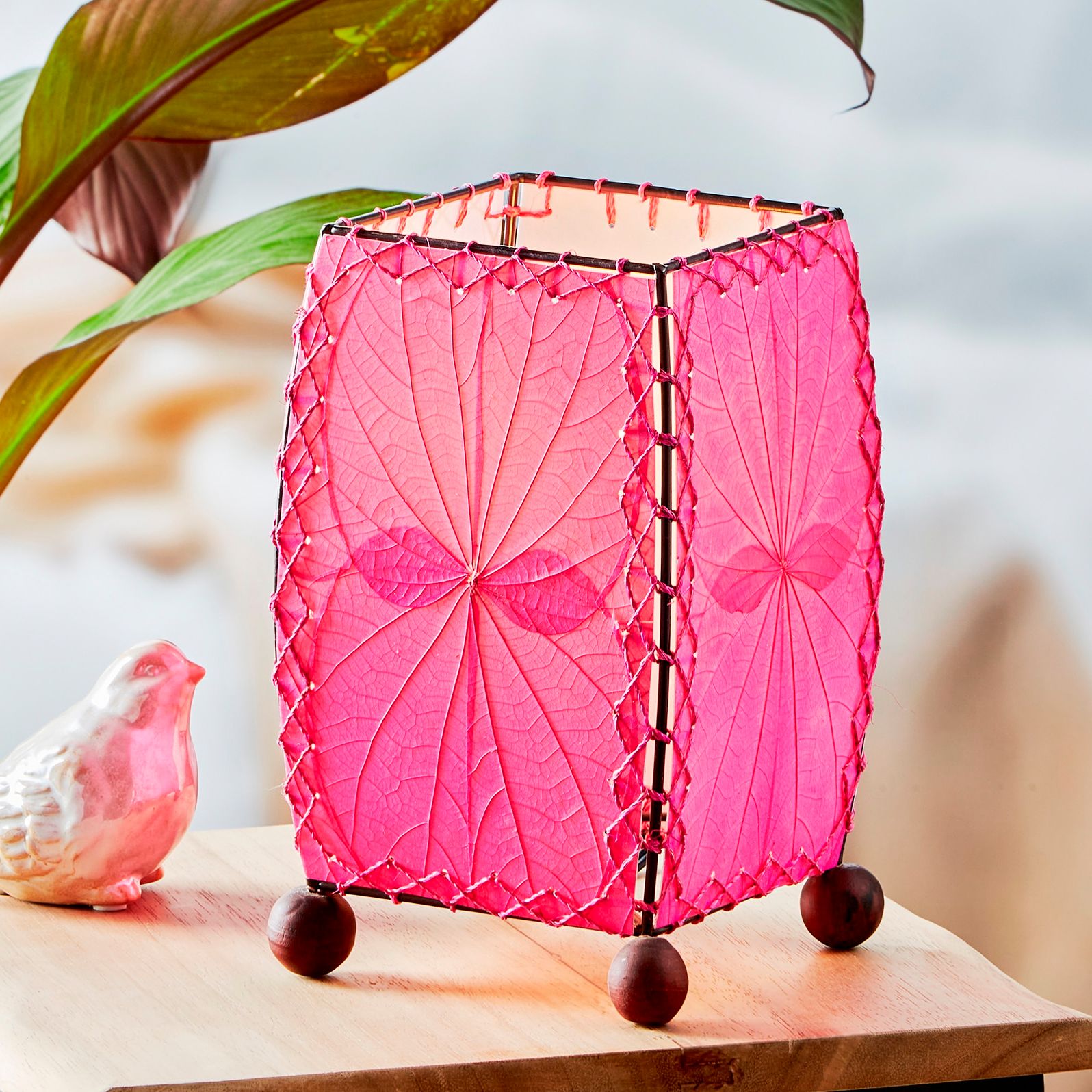 The four sides of this inspired pink accent lamp are made of alibangbang leaves, known throughout the South Pacific for their distinctive butterfly shape. To create this distinctive look, the leaves have been put through a labor-intensive process of fossilization then stained in organic dyes and sealed. The leaf panels are secured to the bowed, powder coated wrought iron frame with dyed fibers from the abaca plant. Decorative ball feet complete this organic design. A stylish accent for any chic decor from Eangee.