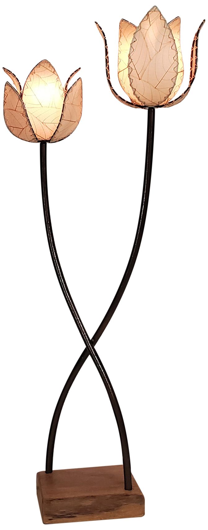 A great addition to a home living space, this Eangee floor lamp adds organic style wherever you put it. It features a pair of lotus flower inspired shades made of fossilized leaves, supported by intertwining necks made of black finish metal. The base at the bottom is made from sustainable solid mango wood.