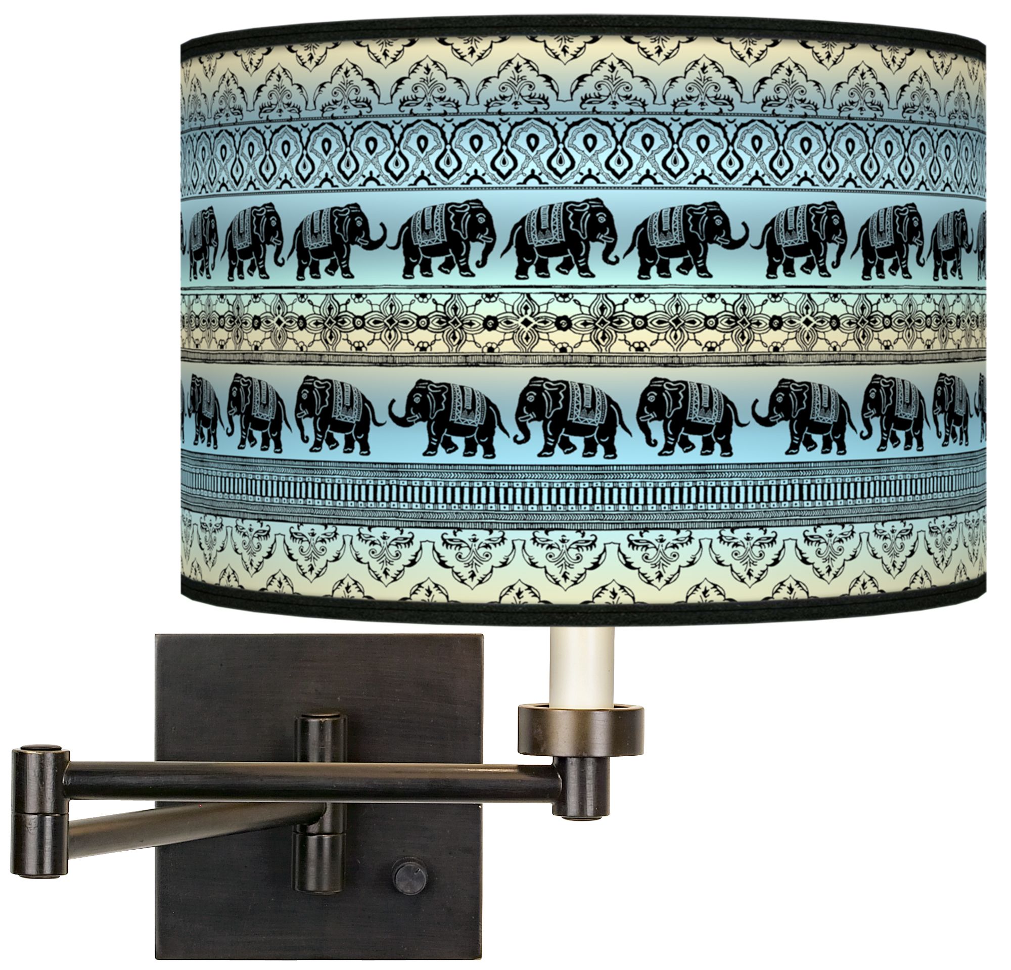 Give your decor a contemporary lift with this giclee shade swing arm wall lamp featuring a custom made-to-order Elephant March pattern shade. The base comes in a warm bronze finish, and has a dimmer switch that allows you to easily adjust the light output. Ample 24" arm extension adds even more convenience to this easy-to-install plug-in lamp. Shade printing process U.S. Patent # 7,347,593.