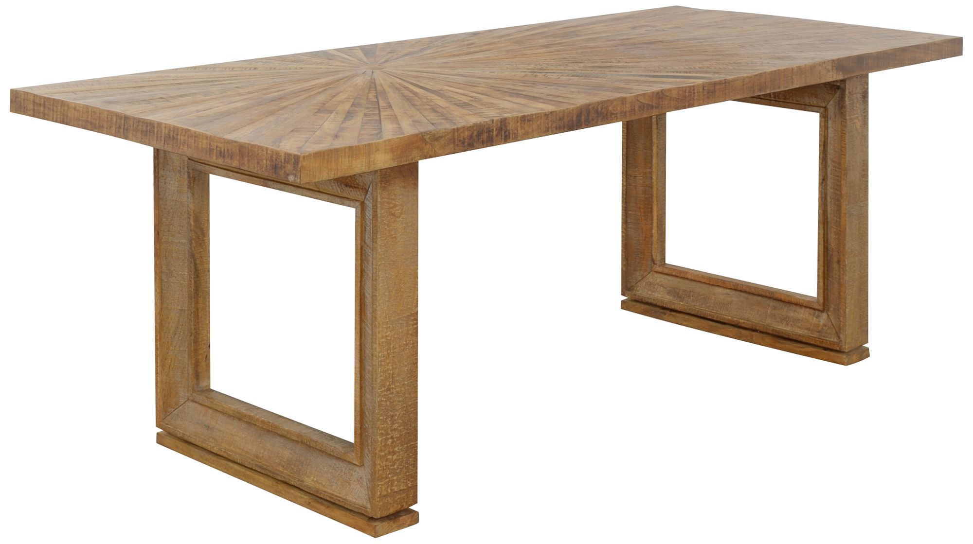 Bring artisan charm to your kitchen with a modern farmhouse solid mango wood dining table. From Coast to Coast Accents, it's a stylish design with an airy profile and substantial design. Its offset sunburst design tabletop is set atop picture frame legs that add depth and dimension. A natural brown finish complements in a variety of settings.