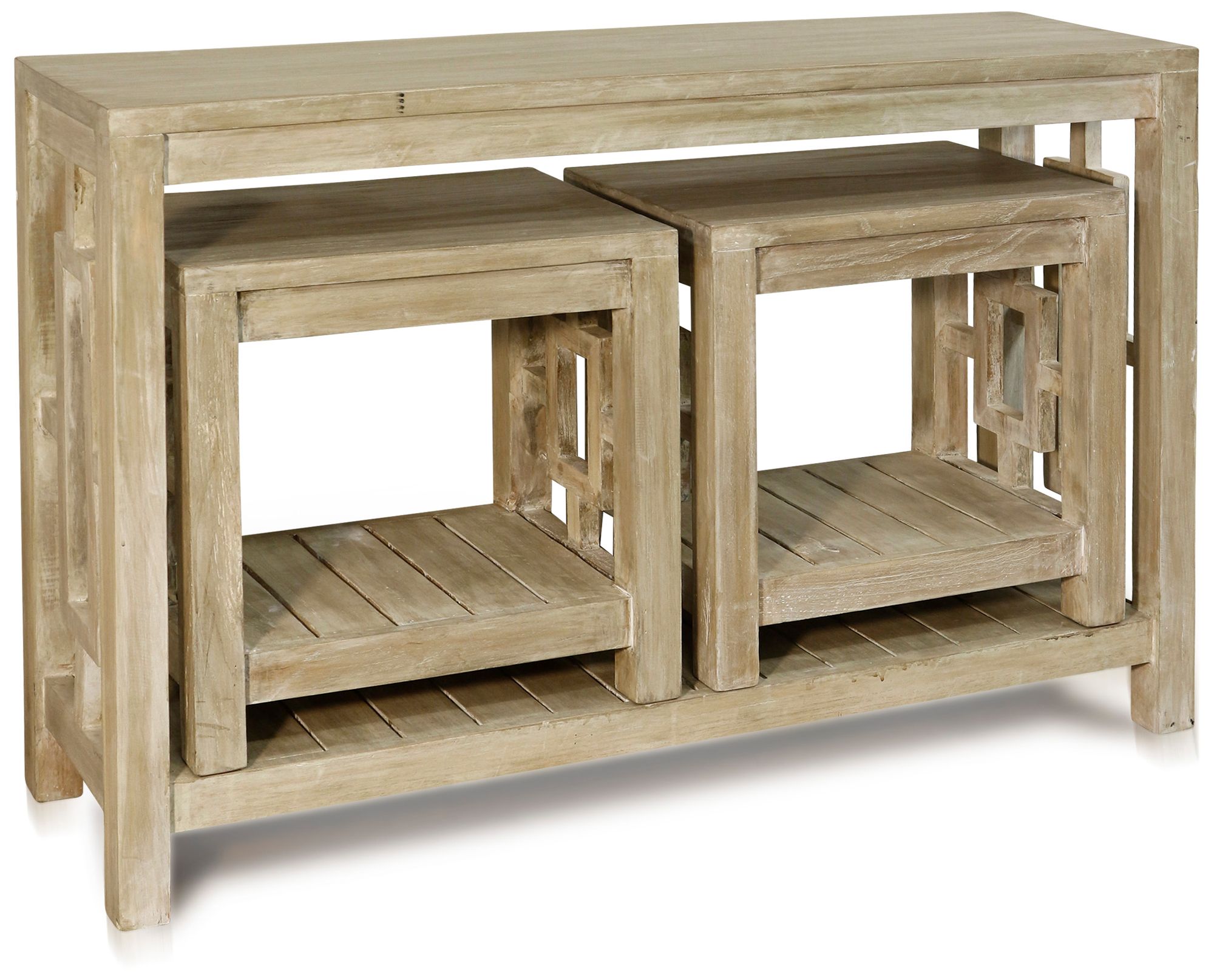 • Set of three farmhouse rectangular nesting tables from the Elyse collection. Set includes one console table and two matching side tables.