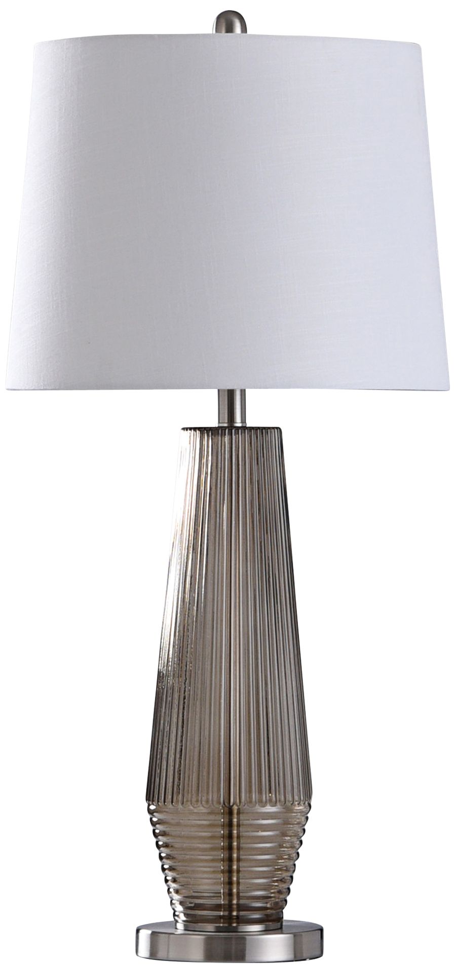 The Erica table lamp is a gorgeous example of transitional decor with its gentle colors and mixed materials. A lovely addition to a desk, buffet, or end table, this lamp has a white fabric shade and a light taupe ribbed glass pillar body. The central support pole is visible through the glass, and the brushed steel base is a lustrous finishing touch. Display this taupe glass lamp in a living room, bedroom, or office.