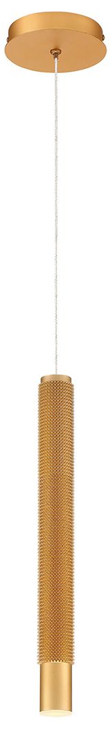 A slender cylinder pendnat with a smooth and textured gold finish. Cylinder has a computerized textured finish